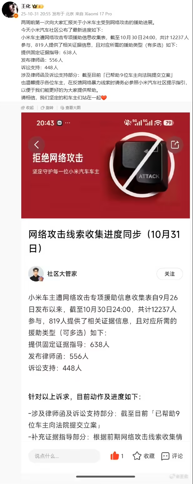 截至10月30日24時(shí),共有12237名車主參與專項(xiàng)援助信息登記,其中819人提交了與網(wǎng)絡(luò)攻擊相關(guān)的證據(jù)材料。根據(jù)車主需求,援助類型分為四類:638人申請(qǐng)固定證據(jù)指導(dǎo),556人需要發(fā)布律師函,448人尋求訴訟支持,部分車主同時(shí)選擇多項(xiàng)援助服務(wù)。目前,針對(duì)涉及律師函及訴訟支持的車主,小米已協(xié)助9人完成法院立案程序。