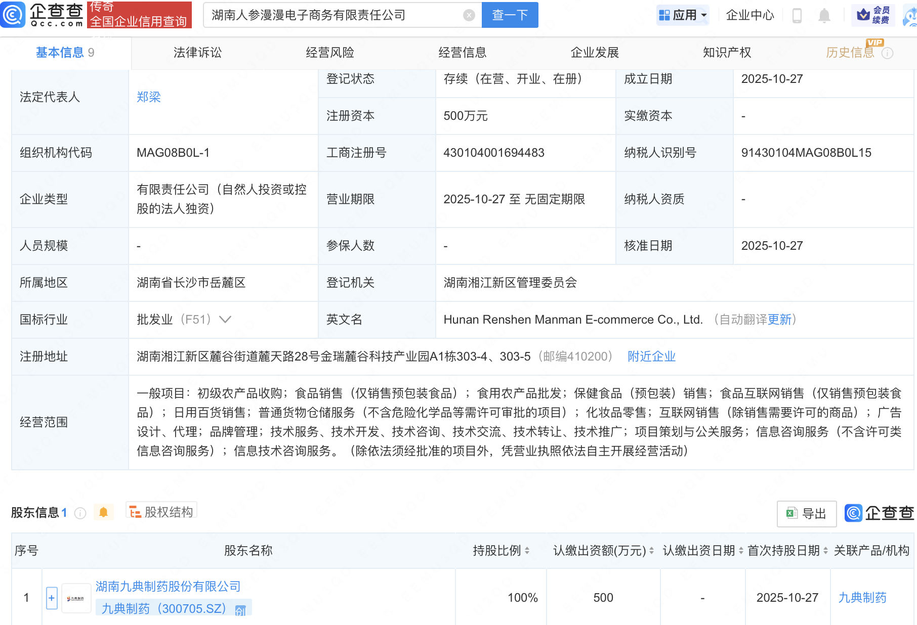 企查查APP顯示,近日,湖南人參漫漫電子商務(wù)有限責(zé)任公司成立,法定代表人為鄭梁,經(jīng)營范圍包含:化妝品零售;互聯(lián)網(wǎng)銷售(除銷售需要許可的商品);廣告設(shè)計(jì)、代理;品牌管理等。企查查股權(quán)穿透顯示,該公司由九典制藥(300705)全資持股。