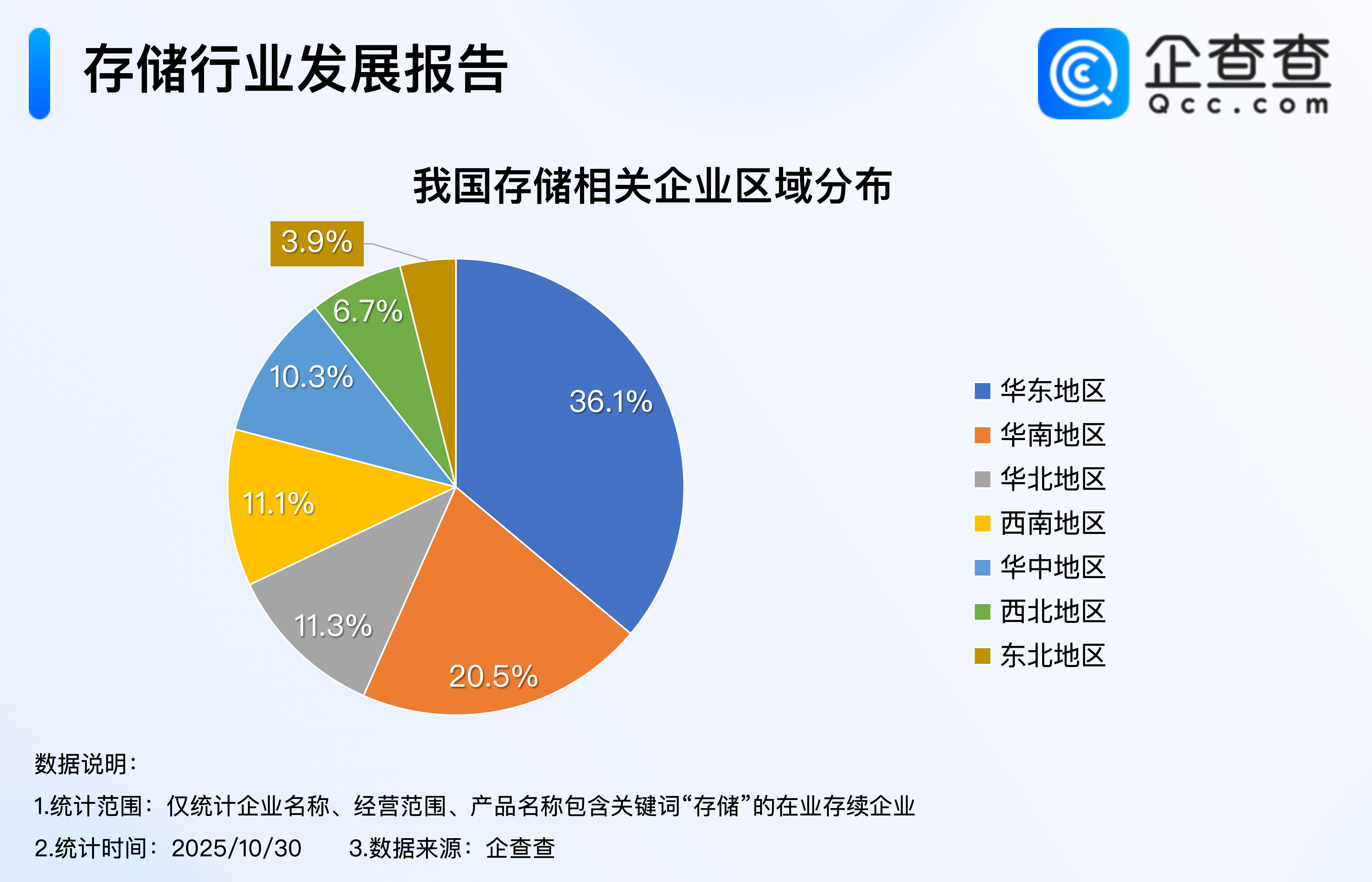 企查查數(shù)據(jù)顯示,截至10月30日,2025年我國(guó)已注冊(cè)23.4萬家存儲(chǔ)相關(guān)企業(yè),已超2024年全年,相比2024年同期增加25.6%;與此同時(shí),近年來我國(guó)存儲(chǔ)相關(guān)企業(yè)存量逐年穩(wěn)步增加,現(xiàn)存量已超120萬家;區(qū)域分布上,我國(guó)現(xiàn)存的存儲(chǔ)相關(guān)企業(yè)集中華東、華南地區(qū),其中華東地區(qū)占比36%。