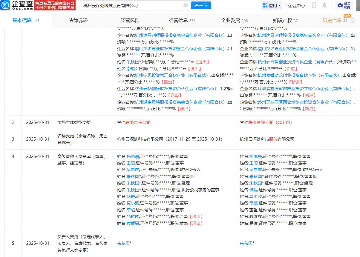 企查查APP顯示,近日,杭州云深處科技股份有限公司發(fā)生工商變更,企業(yè)名稱由杭州云深處科技有限公司變更為杭州云深處科技股份有限公司,市場(chǎng)主體類型變更為“其他股份有限公司(非上市)”;原股東朱秋國、李超等退出,新增深圳愛施德智城產(chǎn)業(yè)投資并購合伙企業(yè)(有限合伙)、杭州云杏智創(chuàng)業(yè)投資合伙企業(yè)(有限合伙)等為股東;同時(shí),公司主要人員亦發(fā)生變更。