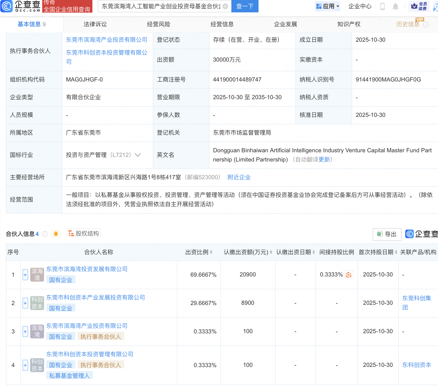 企查查APP顯示,近日,東莞濱海灣人工智能產(chǎn)業(yè)創(chuàng)業(yè)投資母基金合伙企業(yè)(有限合伙)成立,出資額3億元,經(jīng)營范圍包含:以私募基金從事股權(quán)投資、投資管理、資產(chǎn)管理等活動。企查查股權(quán)穿透顯示,該公司由東莞市濱海灣投資發(fā)展有限公司等共同出資。