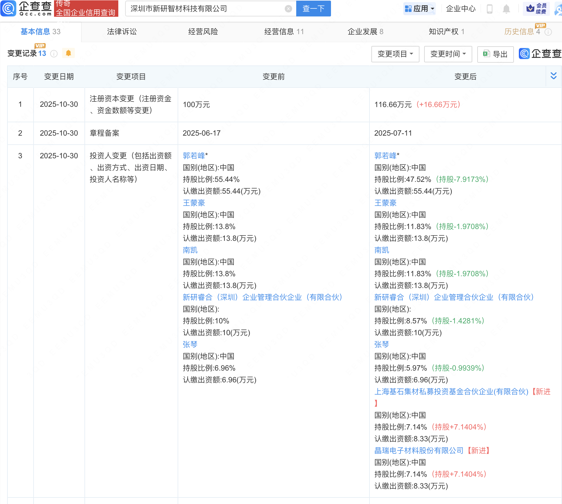 企查查APP顯示,近日,深圳市新研智材科技有限公司發(fā)生工商變更,新增晶瑞電材(300655)等為股東,同時注冊資本增至116.66萬元。企查查信息顯示,該公司成立于2024年,法定代表人為郭若峰,經(jīng)營范圍包含:人工智能公共數(shù)據(jù)平臺;人工智能通用應(yīng)用系統(tǒng);人工智能行業(yè)應(yīng)用系統(tǒng)集成服務(wù);人工智能硬件銷售等。公開信息顯示,新研智材是一家AI驅(qū)動材料研發(fā)的創(chuàng)新企業(yè)。