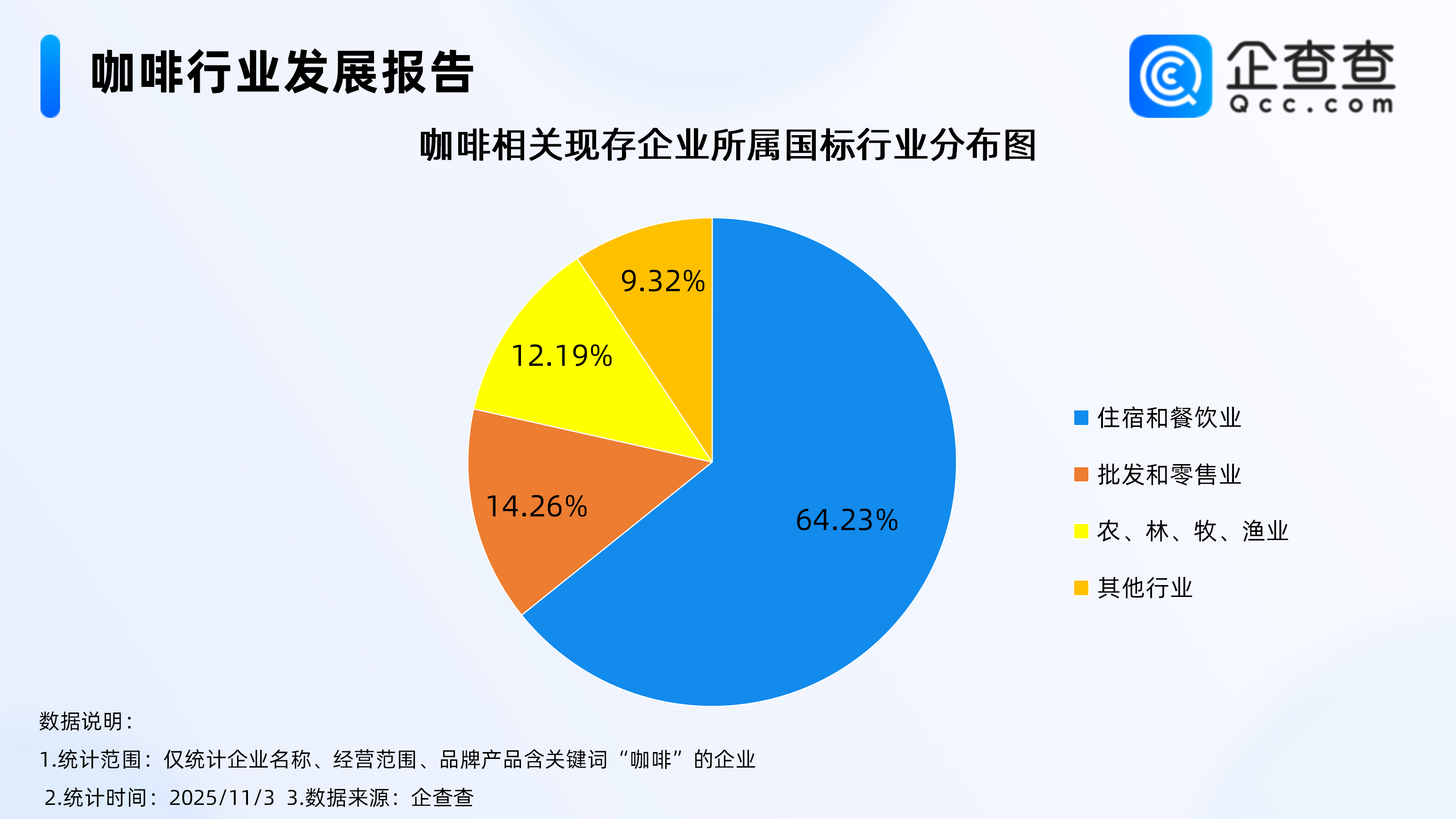 企查查數(shù)據(jù)顯示,從國標行業(yè)分布來看,國內(nèi)咖啡相關(guān)現(xiàn)存企業(yè)中,超6成相關(guān)企業(yè)歸屬于住宿和餐飲業(yè),占比達64.23%。其次為歸屬于批發(fā)和零售業(yè)、農(nóng)林牧漁業(yè)的相關(guān)企業(yè),分別占比14.26%、12.19%。