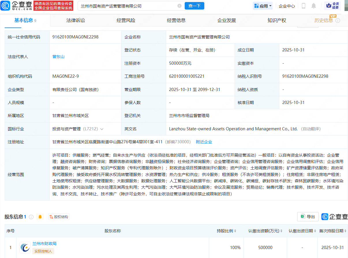 企查查APP顯示,近日,蘭州市國(guó)有資產(chǎn)運(yùn)營(yíng)管理有限公司成立,法定代表人為曾東山,注冊(cè)資本為50億元,經(jīng)營(yíng)范圍包含:以自有資金從事投資活動(dòng);企業(yè)管理;融資咨詢服務(wù);財(cái)務(wù)咨詢;票據(jù)信息咨詢服務(wù);水資源管理等。企查查股權(quán)穿透顯示,該公司由蘭州市財(cái)政局全資持股。