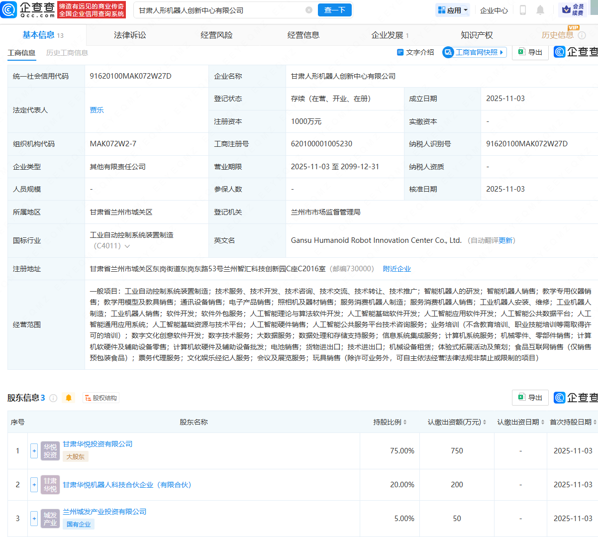企查查APP顯示,近日,甘肅人形機(jī)器人創(chuàng)新中心有限公司成立,法定代表人為賈樂,注冊(cè)資本為1000萬元,經(jīng)營范圍包含:智能機(jī)器人的研發(fā);電子產(chǎn)品銷售;照相機(jī)及器材銷售;服務(wù)消費(fèi)機(jī)器人制造;人工智能基礎(chǔ)軟件開發(fā)等。企查查股權(quán)穿透顯示,該公司由甘肅華悅投資有限公司、甘肅華悅機(jī)器人科技合伙企業(yè)(有限合伙)、蘭州城發(fā)產(chǎn)業(yè)投資有限公司共同持股。