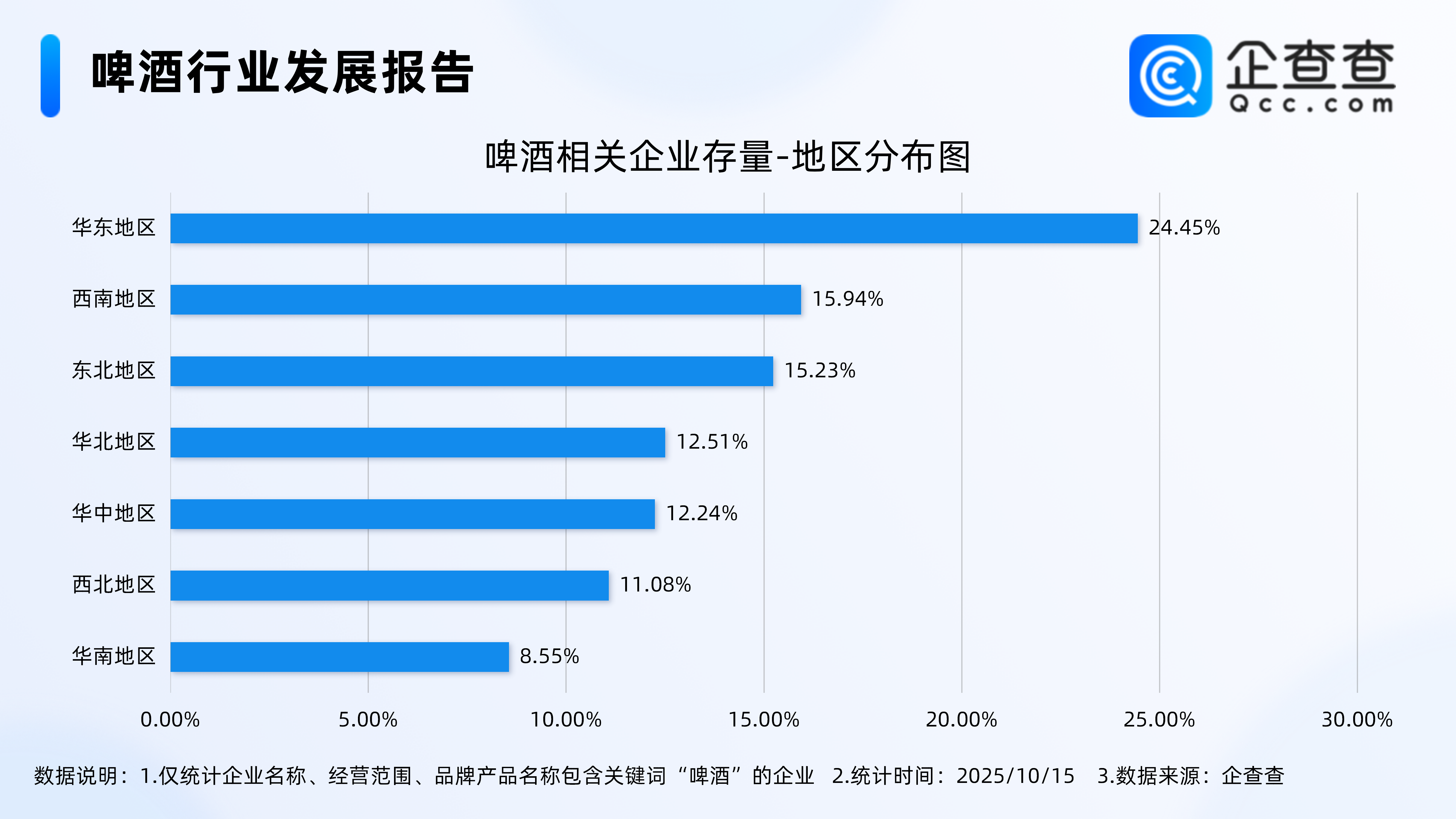 企查查數(shù)據(jù)顯示,從地區(qū)分布來看,啤酒相關(guān)企業(yè)地區(qū)分布較為均勻,其中分布在華東地區(qū)的相關(guān)企業(yè)最多,占比24.45%。其次,分布在西南地區(qū)、東北地區(qū)的相關(guān)企業(yè)分別占比15.94%、15.23%。
