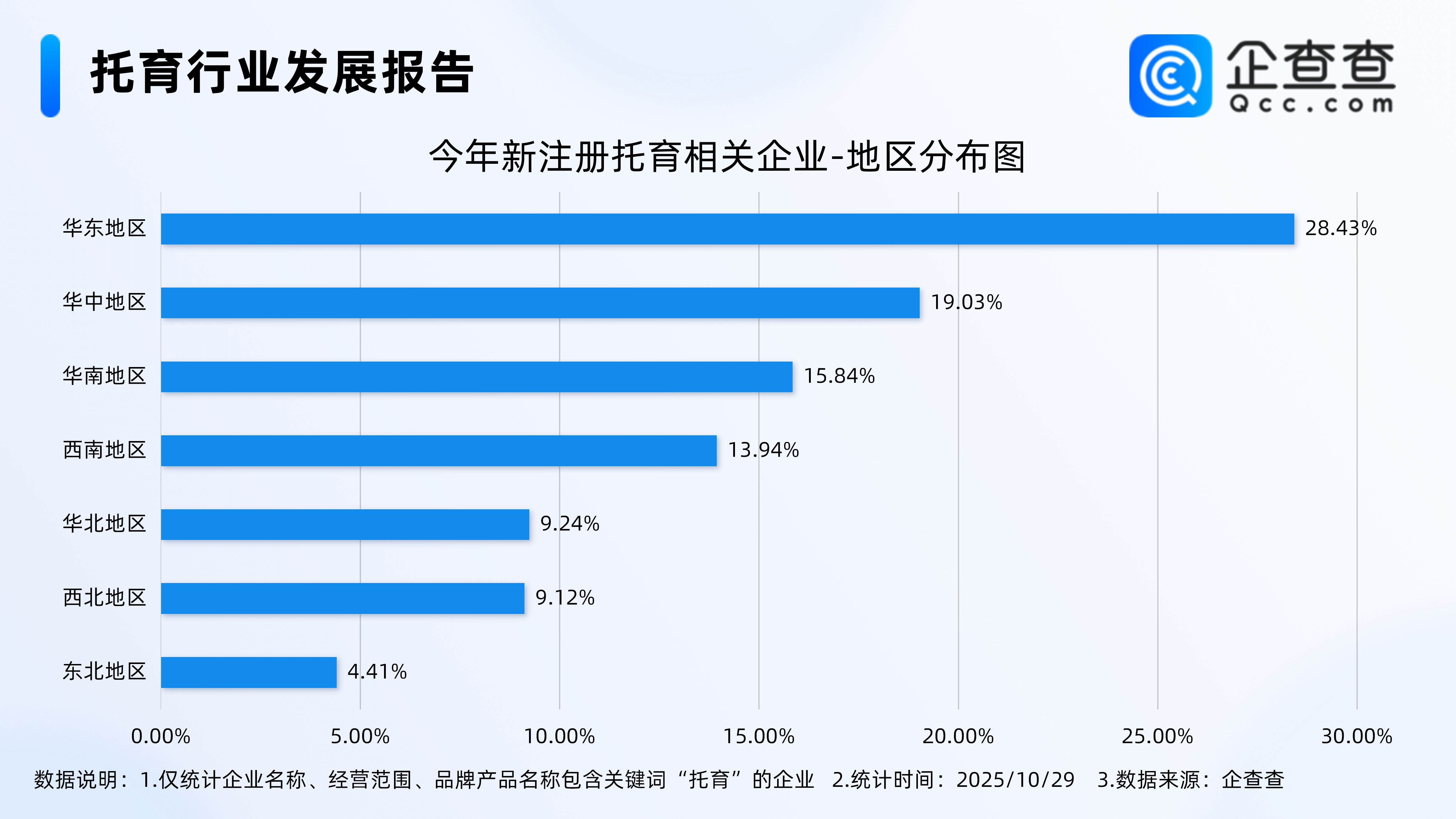 企查查數(shù)據(jù)顯示,注冊(cè)量方面,2021年全年注冊(cè)托育相關(guān)企業(yè)3.37萬(wàn)家,同比增長(zhǎng)90.94%,達(dá)近十年注冊(cè)量峰值。2024年全年注冊(cè)2.41萬(wàn)家相關(guān)企業(yè),截至目前,今年已注冊(cè)1.66萬(wàn)家。從地區(qū)分布來(lái)看,今年新注冊(cè)的托育相關(guān)企業(yè)多分布在華東地區(qū),占比達(dá)28.43%。其次,華中地區(qū)、華南地區(qū)今年新注冊(cè)相關(guān)企業(yè)貢獻(xiàn)率分別為19.03%、15.84%。