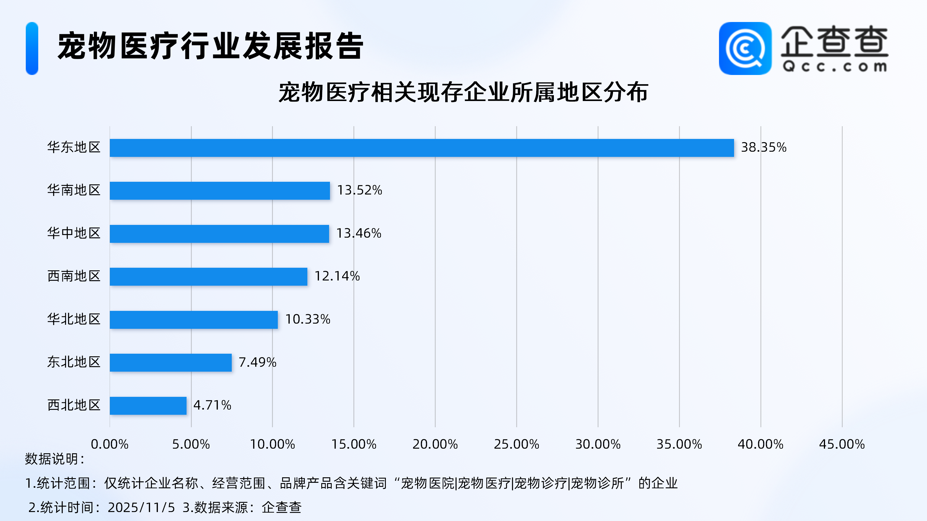 企查查數(shù)據(jù)顯示,截至11月4日,國內(nèi)寵物醫(yī)療相關(guān)現(xiàn)存企業(yè)達(dá)2.24萬家,主要分布在華東地區(qū),占比達(dá)38.35%。分布在華南地區(qū)、華中地區(qū)、西南地區(qū)、華北地區(qū)的相關(guān)企業(yè),占比均在10%-15%之間,其中華南地區(qū)、華中地區(qū)占比相近,分別達(dá)13.52%、13.46%。