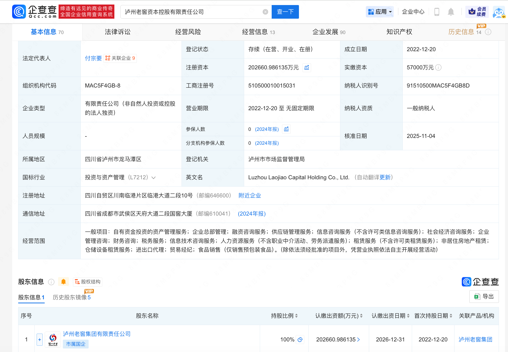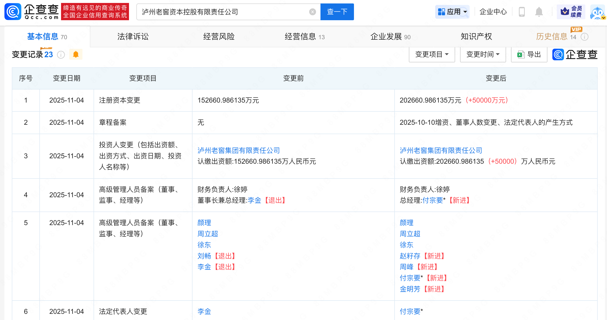 企查查APP顯示,近日,瀘州老窖資本控股有限責(zé)任公司發(fā)生工商變更,注冊資本由約15.3億人民幣增至約20.3億人民幣,增幅約33%,同時,法定代表人及多位主要人員發(fā)生變更。企查查信息顯示,該公司成立于2022年12月,法定代表人為付宗要,由瀘州老窖集團(tuán)有限責(zé)任公司全資持股。