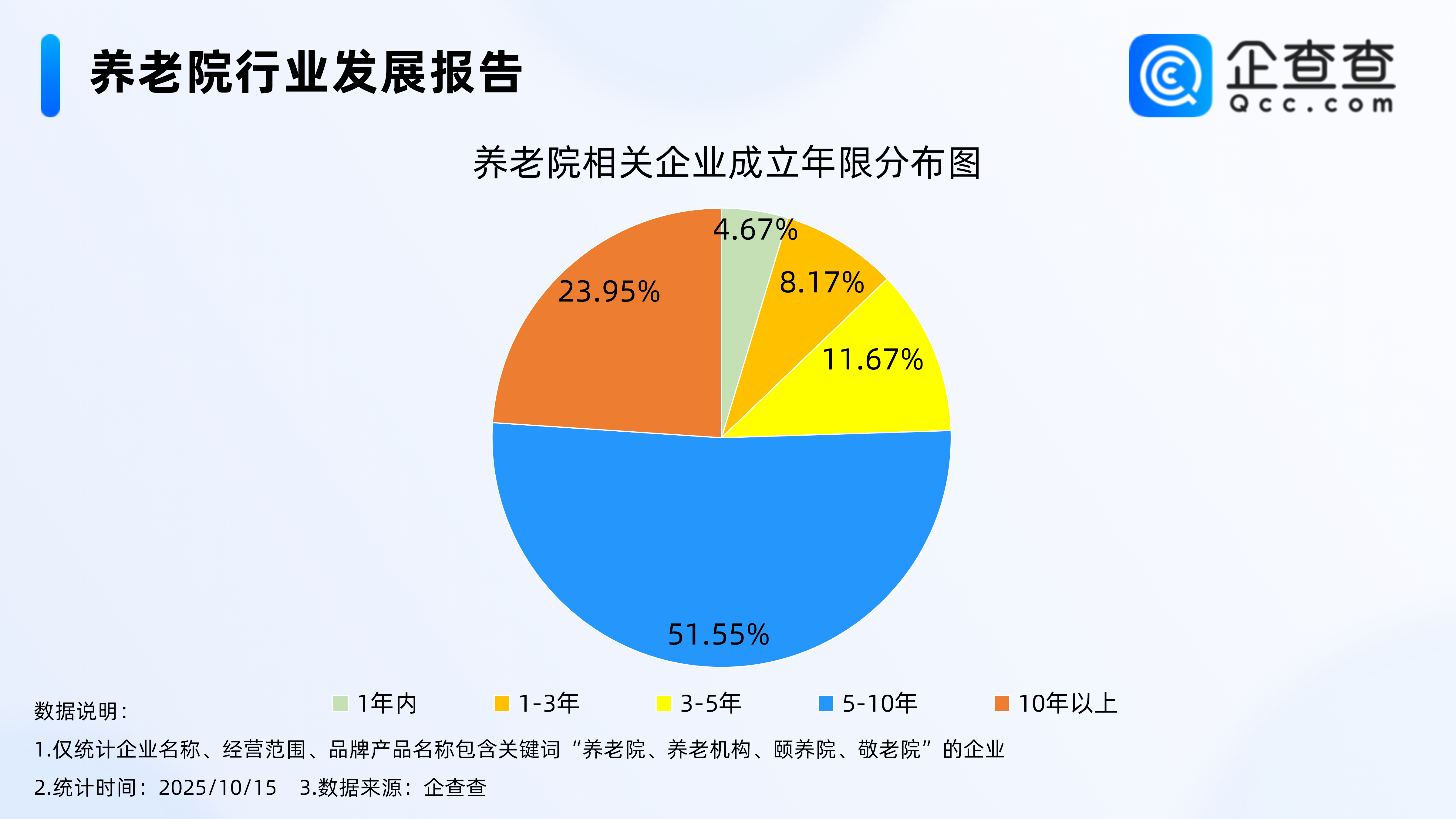 企查查數(shù)據(jù)顯示,從經(jīng)營時(shí)間來看,養(yǎng)老院相關(guān)現(xiàn)存企業(yè)多為老牌企業(yè),超七成相關(guān)企業(yè)成立5年以上,其中成立年限在5-10年的相關(guān)企業(yè)最多,占比51.55%。成立年限在10年以上的相關(guān)企業(yè)占比23.95%。