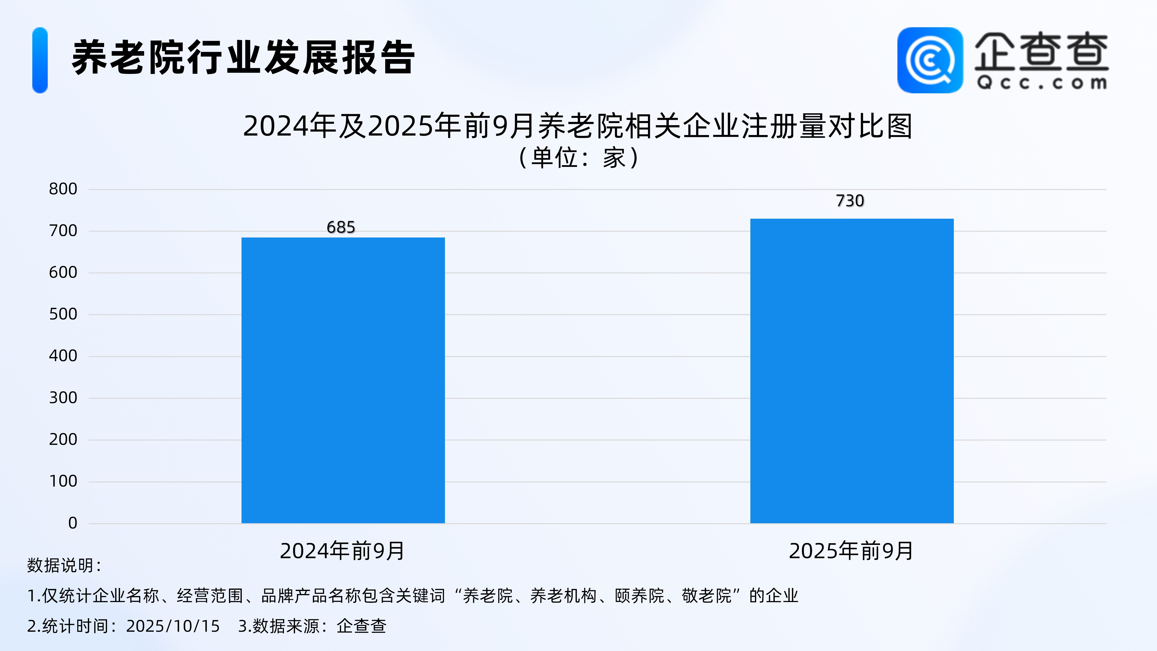 企查查數(shù)據(jù)顯示,截至10月15日,國內(nèi)現(xiàn)存養(yǎng)老院相關(guān)企業(yè)2.94萬家。注冊(cè)量方面,2024年全年注冊(cè)養(yǎng)老院相關(guān)企業(yè)915家,截至目前,今年已注冊(cè)744家,其中前9月注冊(cè)730家,同比增長6.57%。