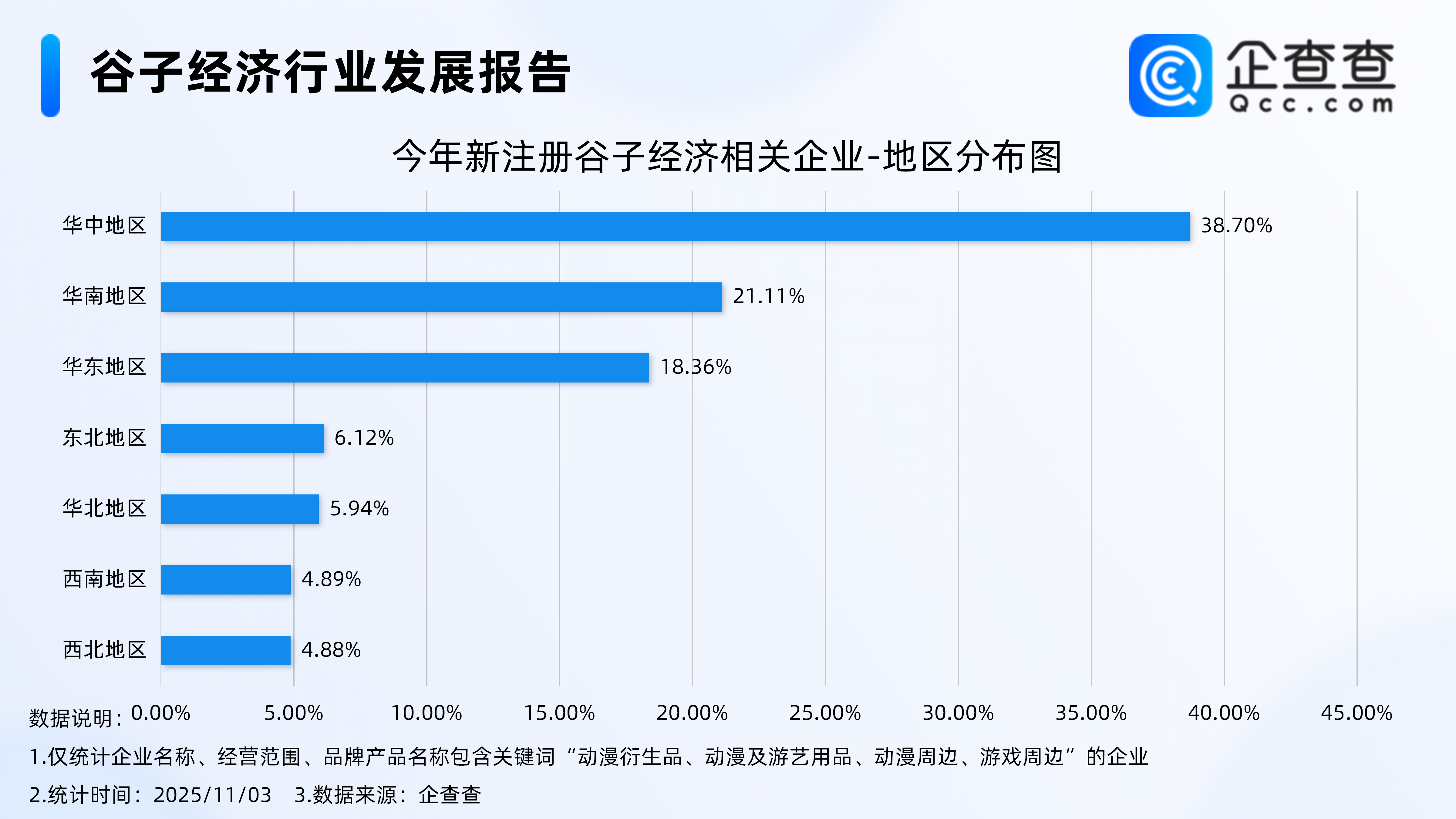 企查查數(shù)據(jù)顯示,從地區(qū)分布來(lái)看,今年新注冊(cè)的谷子經(jīng)濟(jì)相關(guān)企業(yè)多分布在華中地區(qū),占比達(dá)38.70%。其次,分布在華南地區(qū)、華東地區(qū)今年新注冊(cè)的谷子經(jīng)濟(jì)相關(guān)企業(yè)分別占比21.11%、18.36%。