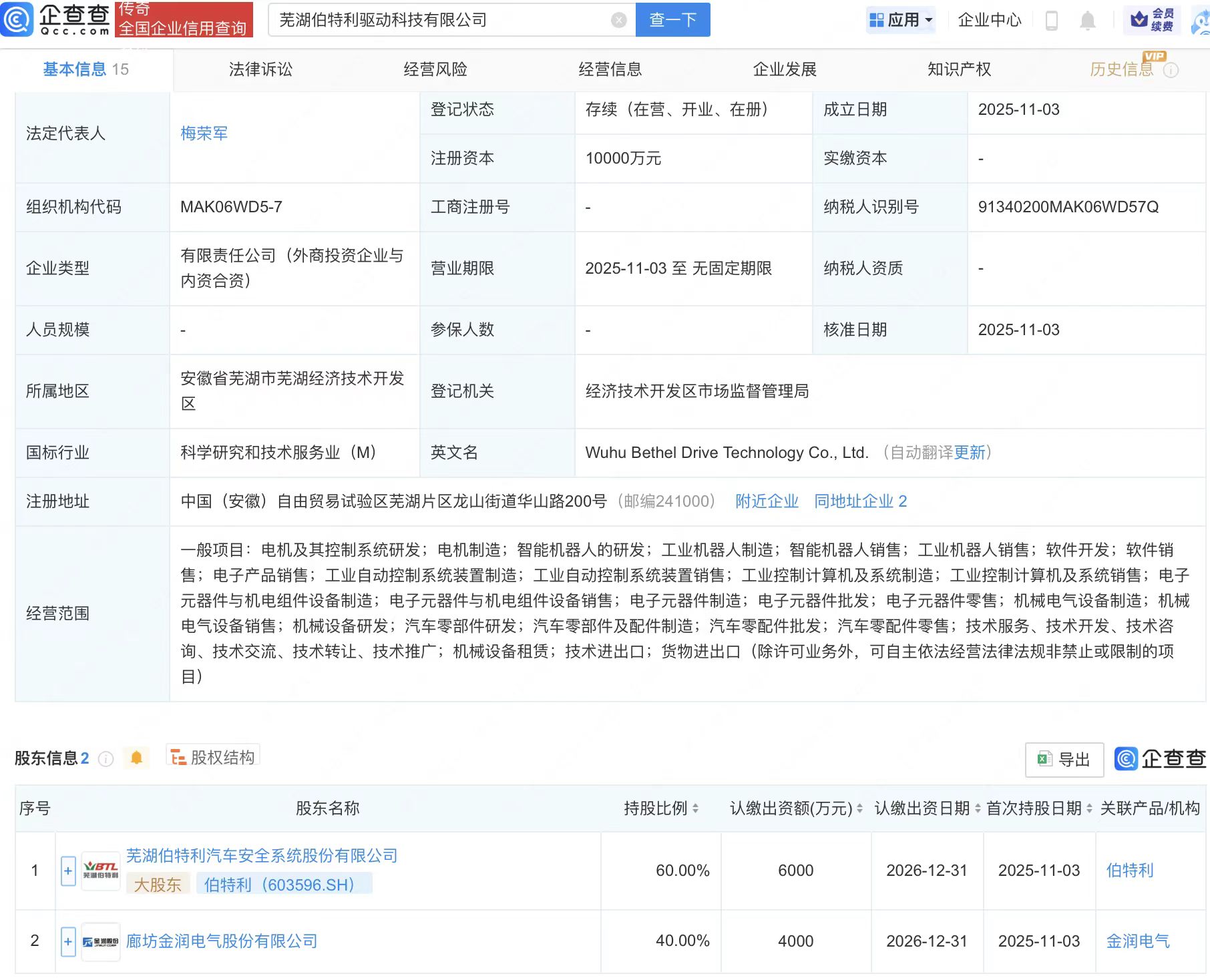 企查查APP顯示,近日,蕪湖伯特利驅(qū)動(dòng)科技有限公司成立,注冊(cè)資本1億元,經(jīng)營(yíng)范圍包含:智能機(jī)器人的研發(fā);工業(yè)機(jī)器人制造;智能機(jī)器人銷(xiāo)售;工業(yè)機(jī)器人銷(xiāo)售等。企查查股權(quán)穿透顯示,該公司由伯特利(603596)等共同持股。