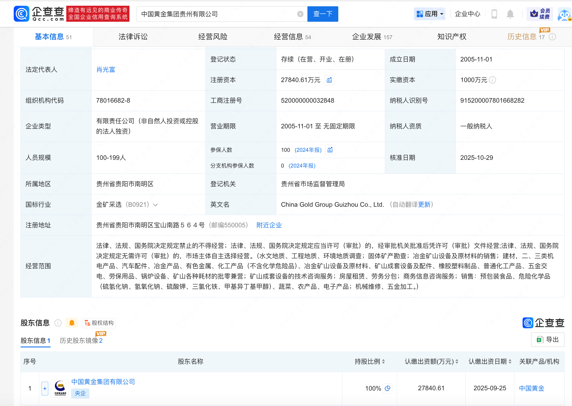 企查查APP顯示,近日,中國黃金集團(tuán)貴州有限公司發(fā)生工商變更,注冊(cè)資本由1000萬人民幣增至約2.8億人民幣,增幅約2684%。企查查信息顯示,該公司成立于2005年11月,法定代表人為肖光富,經(jīng)營范圍含水文地質(zhì)、工程地質(zhì)、環(huán)境地質(zhì)調(diào)查等,由中國黃金集團(tuán)有限公司全資持股。