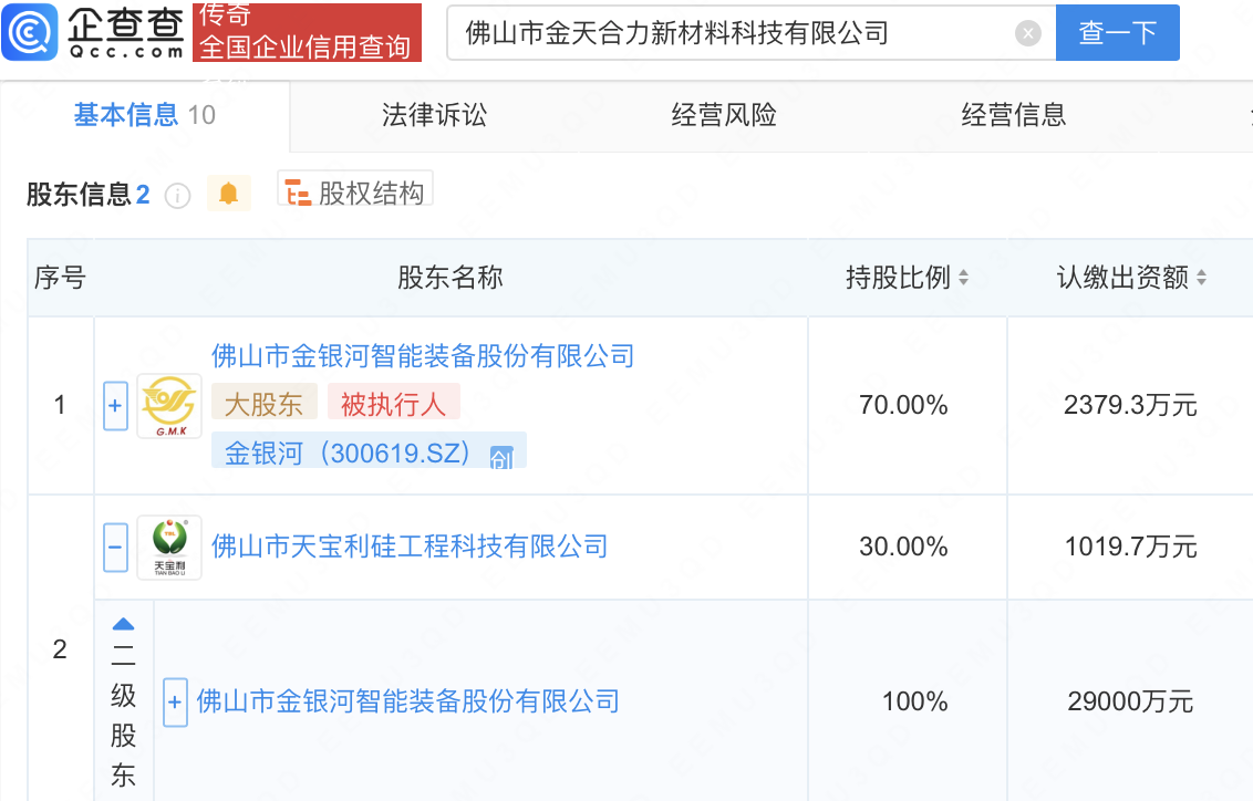 企查查APP顯示,近日,佛山市金天合力新材料科技有限公司成立,注冊資本3399萬元,經(jīng)營范圍包含:電子專用材料制造;電子專用材料研發(fā);電子專用材料銷售;新型膜材料制造等。企查查股權(quán)穿透顯示,該公司由金銀河(300619)間接全資持股。