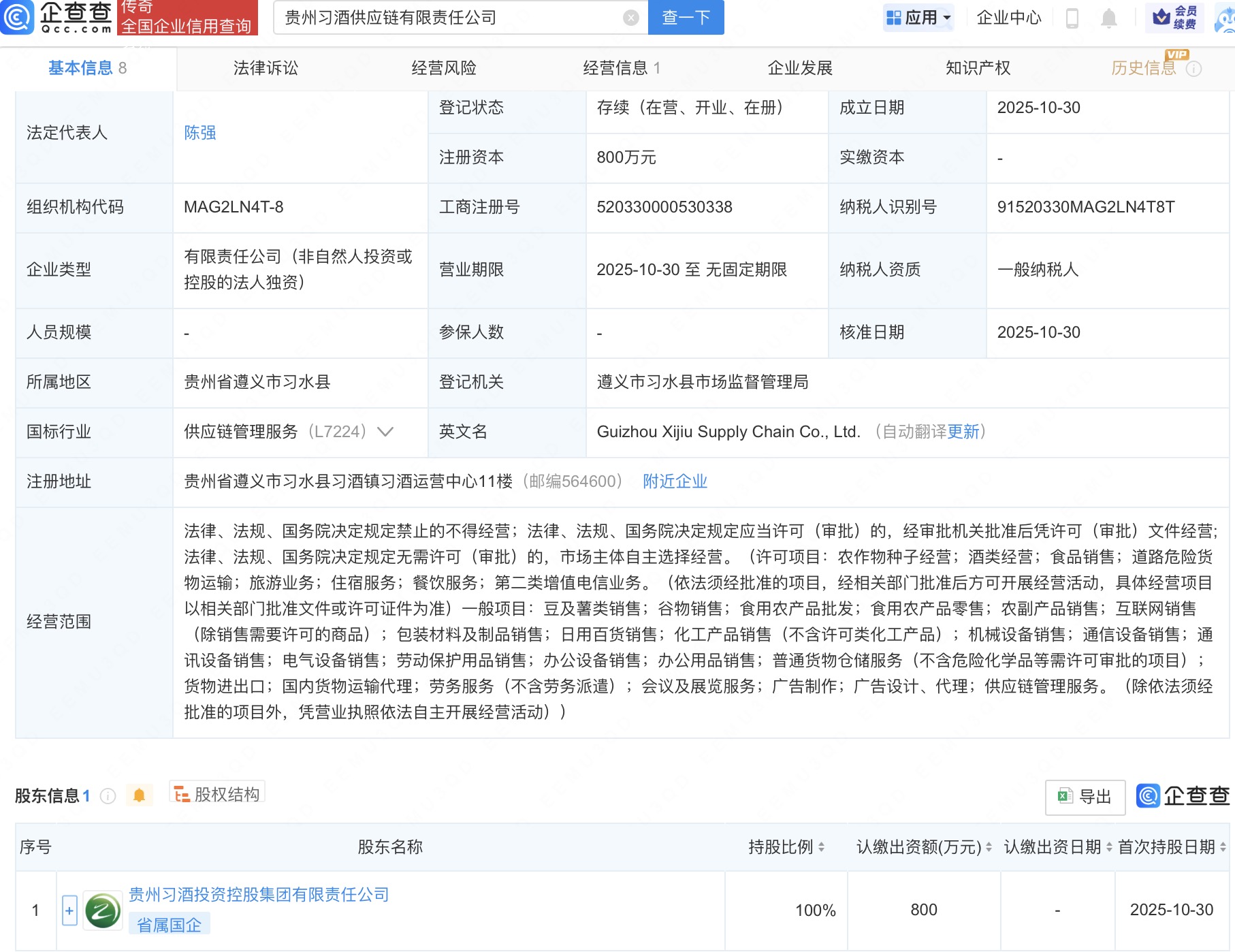 企查查APP顯示,近日,貴州習(xí)酒供應(yīng)鏈有限責(zé)任公司成立,法定代表人為陳強(qiáng),經(jīng)營(yíng)范圍含農(nóng)作物種子經(jīng)營(yíng)、酒類經(jīng)營(yíng)、食品銷售、豆及薯類銷售、谷物銷售等。企查查股權(quán)穿透顯示,該公司由貴州習(xí)酒投資控股集團(tuán)有限責(zé)任公司全資持股。