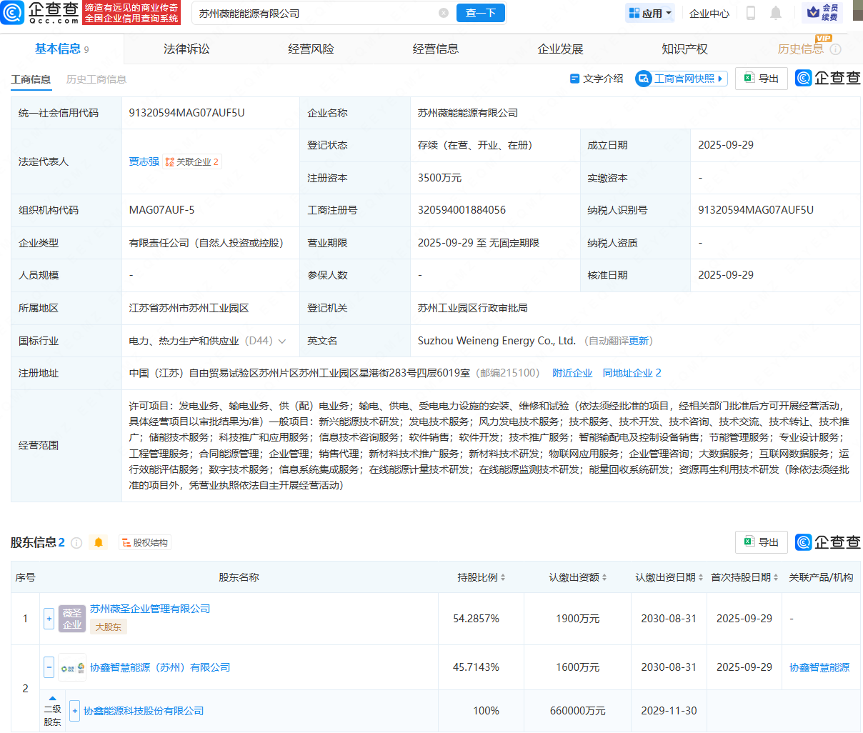 企查查APP顯示,近日,蘇州薇能能源有限公司成立,法定代表人為賈志強,注冊資本為3500萬元,經(jīng)營范圍包含:發(fā)電業(yè)務(wù)、輸電業(yè)務(wù)、供(配)電業(yè)務(wù);發(fā)電技術(shù)服務(wù);儲能技術(shù)服務(wù);能量回收系統(tǒng)研發(fā)等。企查查股權(quán)穿透顯示,該公司由蘇州薇圣企業(yè)管理有限公司、協(xié)鑫能科(002015)全資子公司協(xié)鑫智慧能源(蘇州)有限公司共同持股。