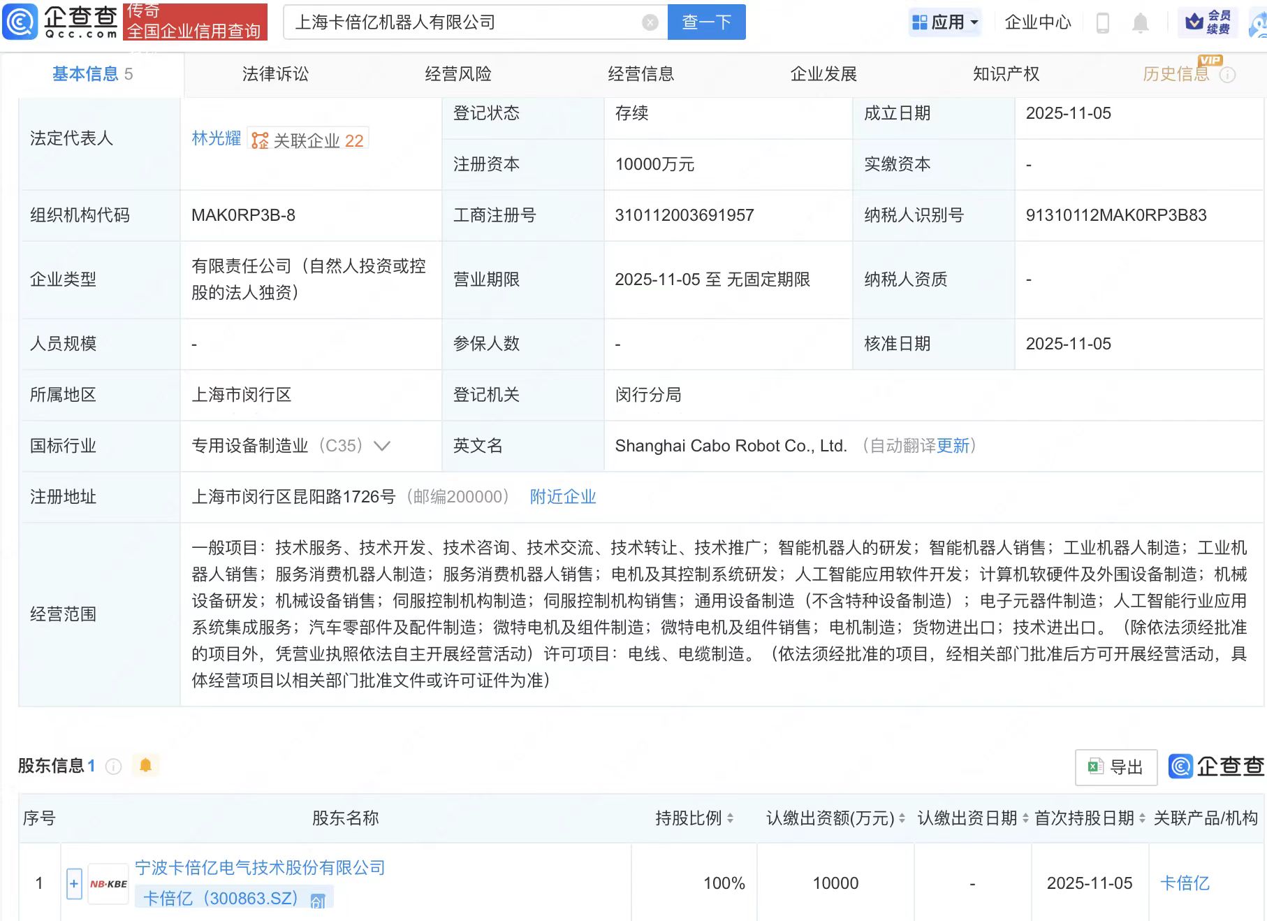 企查查APP顯示,近日,上海卡倍億機(jī)器人有限公司成立,注冊資本1億元,經(jīng)營范圍包含:智能機(jī)器人的研發(fā);智能機(jī)器人銷售;工業(yè)機(jī)器人制造;人工智能應(yīng)用軟件開發(fā)等。企查查股權(quán)穿透顯示,該公司由卡倍億(300863)全資持股。