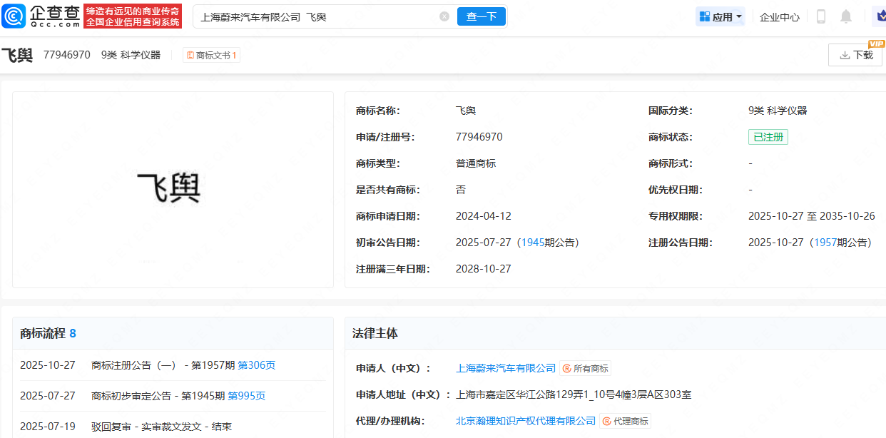 企查查APP顯示,近日,上海蔚來(lái)汽車有限公司申請(qǐng)的“飛輿”商標(biāo)注冊(cè)成功,國(guó)際分類為9類 科學(xué)儀器,已申請(qǐng)商品/服務(wù)包括:集成電路卡;智能卡(集成電路卡);芯片卡;微芯片卡;集成電路;電子芯片等。