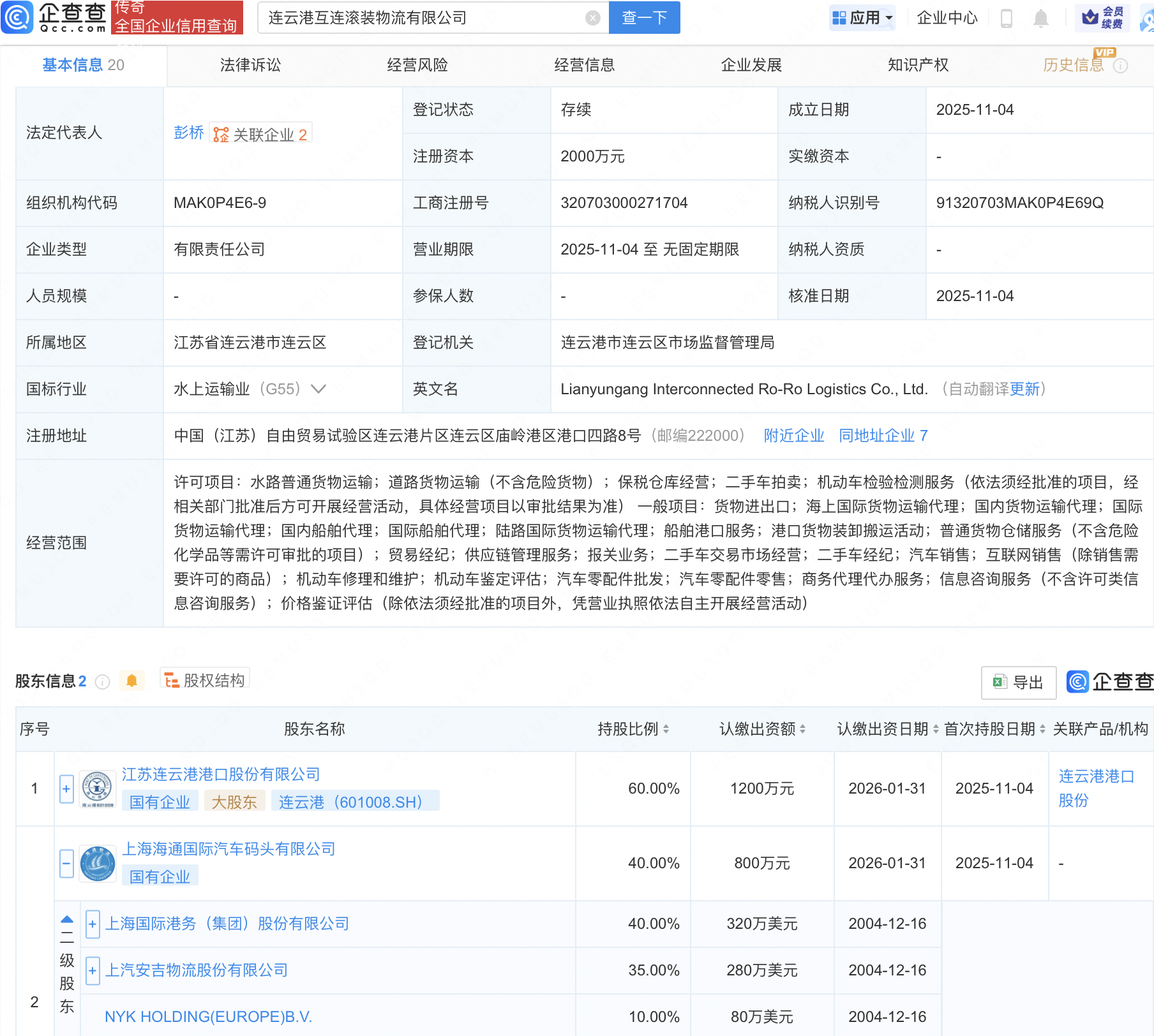 企查查APP顯示,近日,連云港互連滾裝物流有限公司成立,注冊(cè)資本2000萬元,經(jīng)營范圍包含:供應(yīng)鏈管理服務(wù);報(bào)關(guān)業(yè)務(wù);二手車交易市場經(jīng)營;二手車經(jīng)紀(jì);汽車銷售等。企查查股權(quán)穿透顯示,該公司由連云港(601008)、上港集團(tuán)(600018)持股公司上海海通國際汽車碼頭有限公司共同持股。