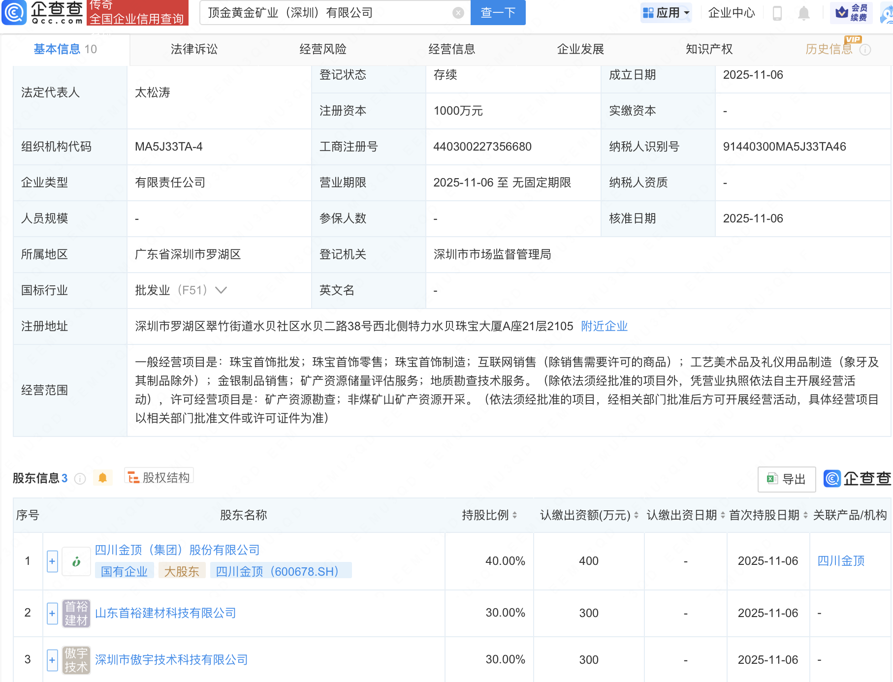 企查查APP顯示,近日,頂金黃金礦業(yè)(深圳)有限公司成立,注冊(cè)資本1000萬(wàn)元,經(jīng)營(yíng)范圍包含:礦產(chǎn)資源儲(chǔ)量評(píng)估服務(wù);地質(zhì)勘查技術(shù)服務(wù);礦產(chǎn)資源勘查;非煤礦山礦產(chǎn)資源開(kāi)采等。企查查股權(quán)穿透顯示,該公司由四川金頂(600678)等共同持股。