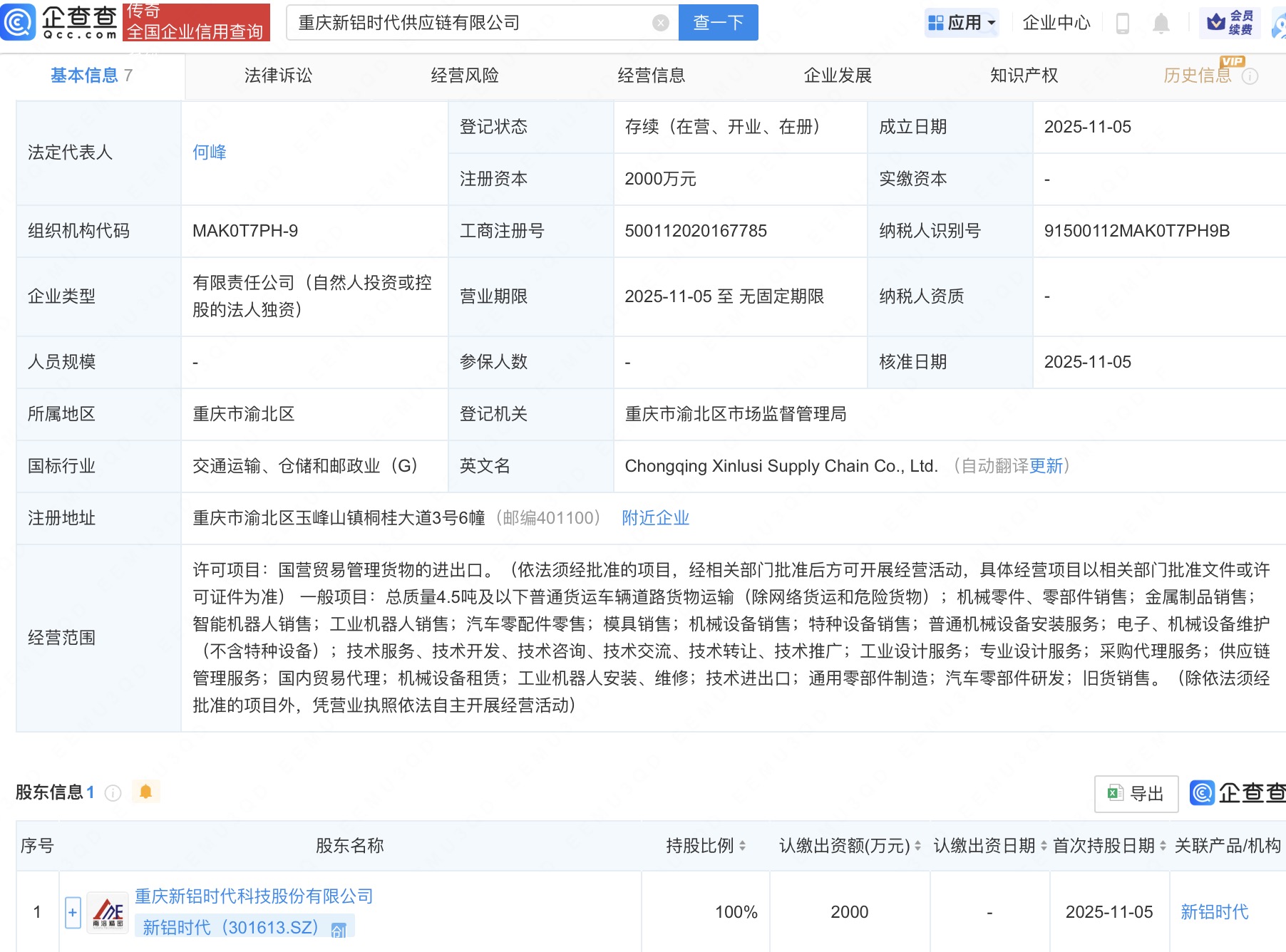 企查查APP顯示,近日,重慶新鋁時(shí)代供應(yīng)鏈有限公司成立,注冊(cè)資本2000萬(wàn)元,經(jīng)營(yíng)范圍包含:智能機(jī)器人銷(xiāo)售;工業(yè)機(jī)器人銷(xiāo)售;汽車(chē)零配件零售;模具銷(xiāo)售等。企查查股權(quán)穿透顯示,該公司由新鋁時(shí)代(301613)全資持股。