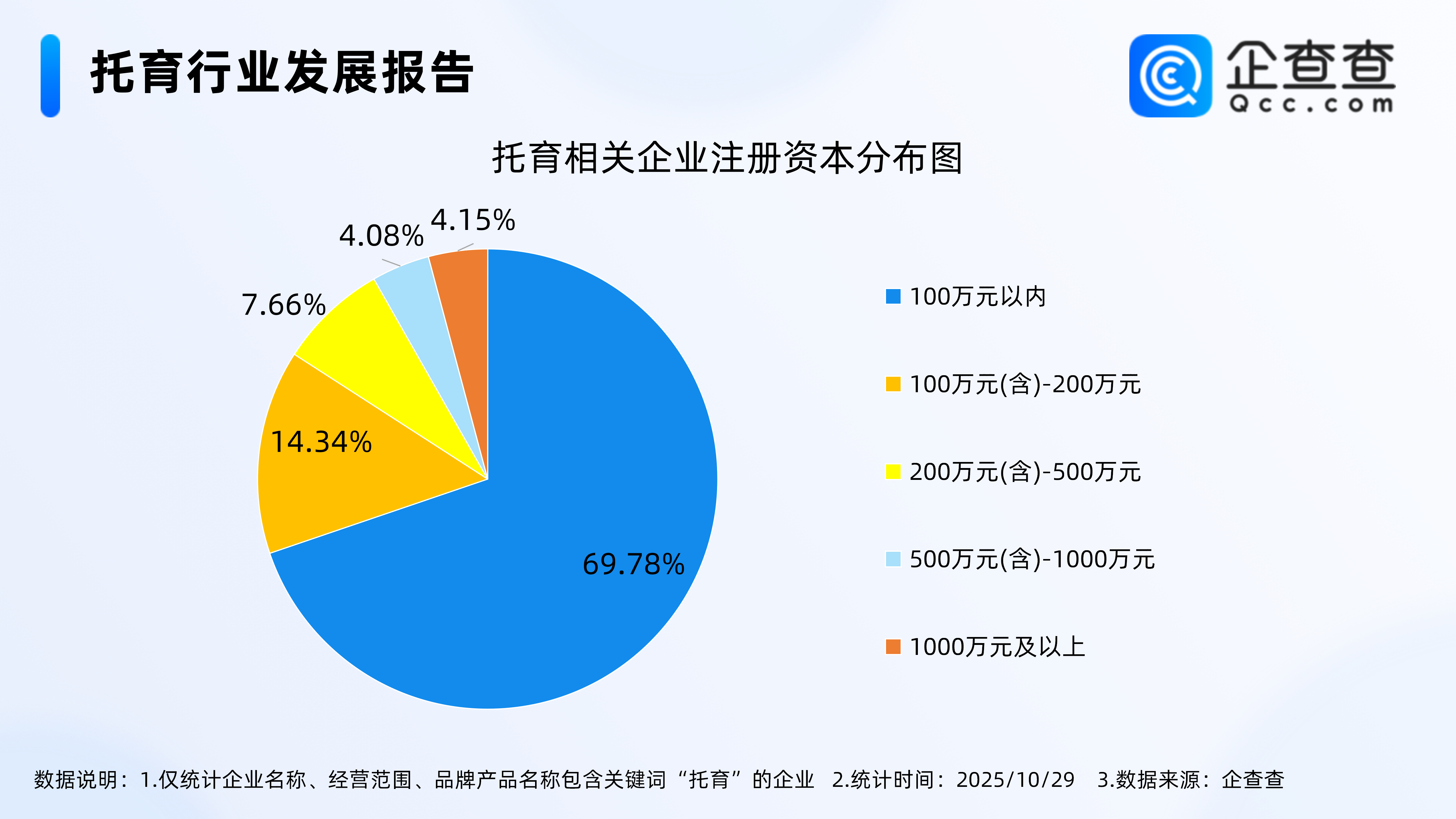 企查查數(shù)據(jù)顯示,從注冊資本來看,托育相關(guān)企業(yè)多為輕量級企業(yè),注冊資本在100萬元以內(nèi)的相關(guān)企業(yè)最多,占比近七成,達(dá)69.78%。其次,注冊資本在100萬元(含)-200萬元的相關(guān)企業(yè)占比14.34%。