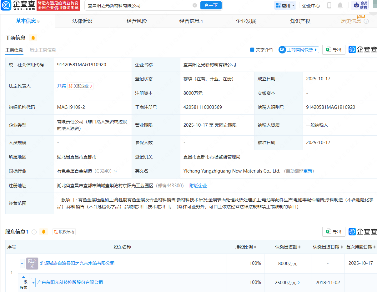 企查查APP顯示,近日,宜昌陽之光新材料有限公司成立,法定代表人為尹騰,注冊資本為8000萬元,經營范圍包含:有色金屬壓延加工;高性能有色金屬及合金材料銷售;新材料技術研發(fā);電池零配件生產等。企查查股權穿透顯示,該公司由東陽光(600673)間接全資持股。