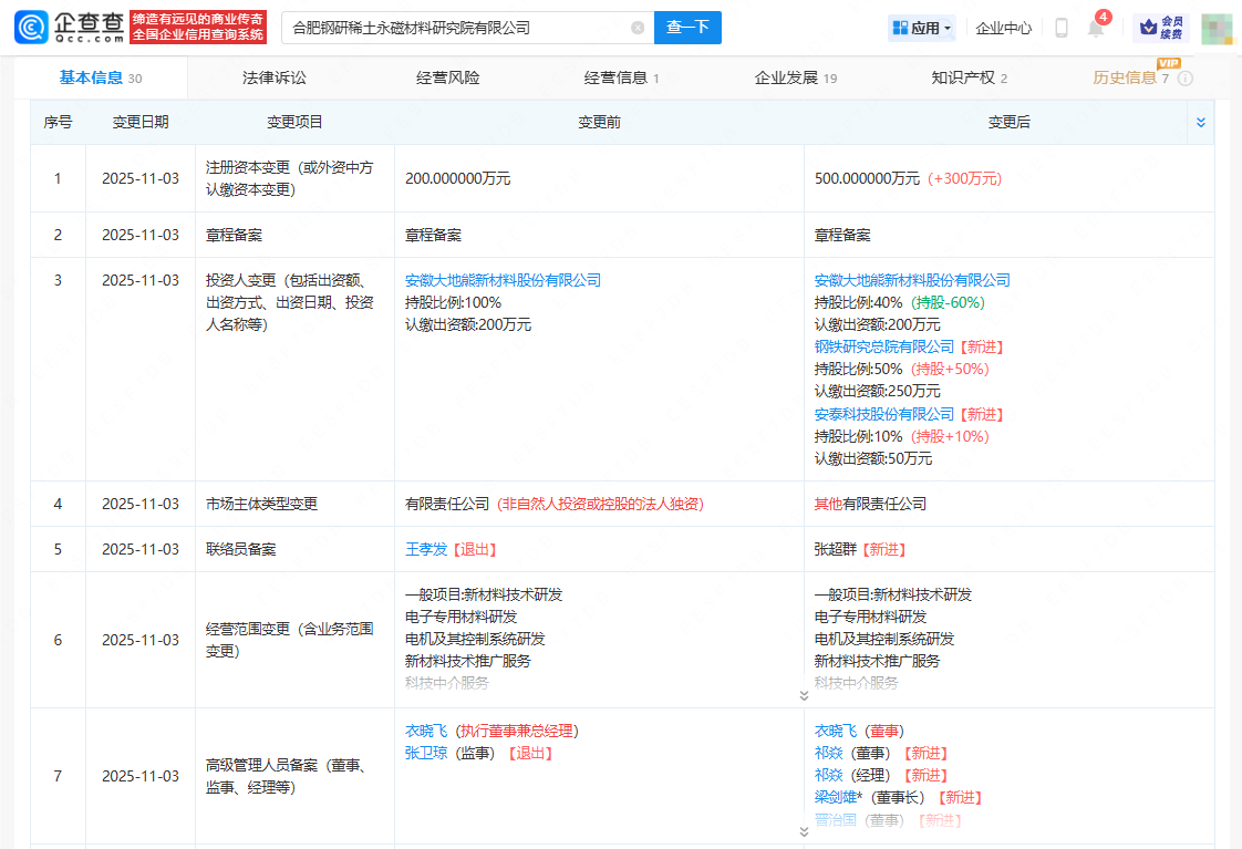 企查查APP顯示,近日,合肥鋼研稀土永磁材料研究院有限公司發(fā)生工商變更,新增安泰科技(000969)、鋼鐵研究總院有限公司為股東,注冊資本由200萬元人民幣增至500萬元人民幣,同時(shí)法定代表人及高管均發(fā)生變更。企查查信息顯示,合肥鋼研稀土永磁材料研究院公司成立于2023年9月,經(jīng)營范圍涉及新材料技術(shù)研發(fā)、電子專用材料研發(fā)、新材料技術(shù)推廣服務(wù)等,原股東大地熊(688077)當(dāng)前持股比例為40%。