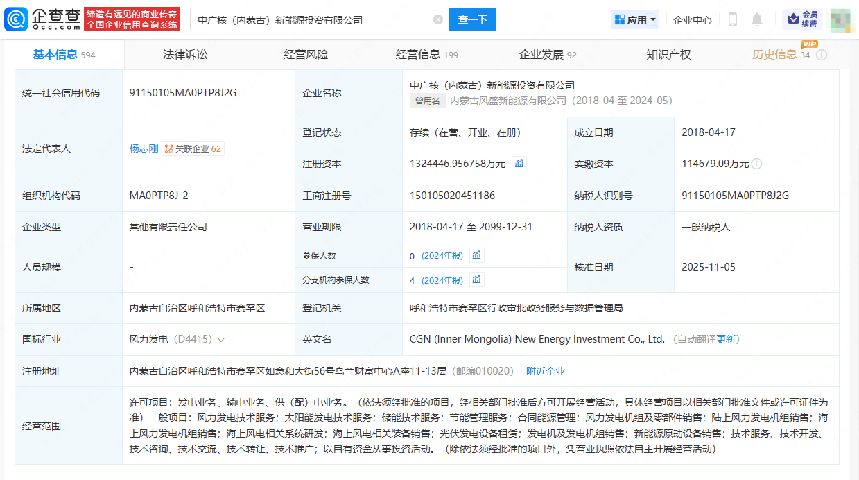 企查查信息顯示,中廣核(內(nèi)蒙古)新能源投資公司成立于2018年4月,經(jīng)營范圍涉及風(fēng)力發(fā)電技術(shù)服務(wù)、太陽能發(fā)電技術(shù)服務(wù)、儲(chǔ)能技術(shù)服務(wù)、節(jié)能管理服務(wù)等。