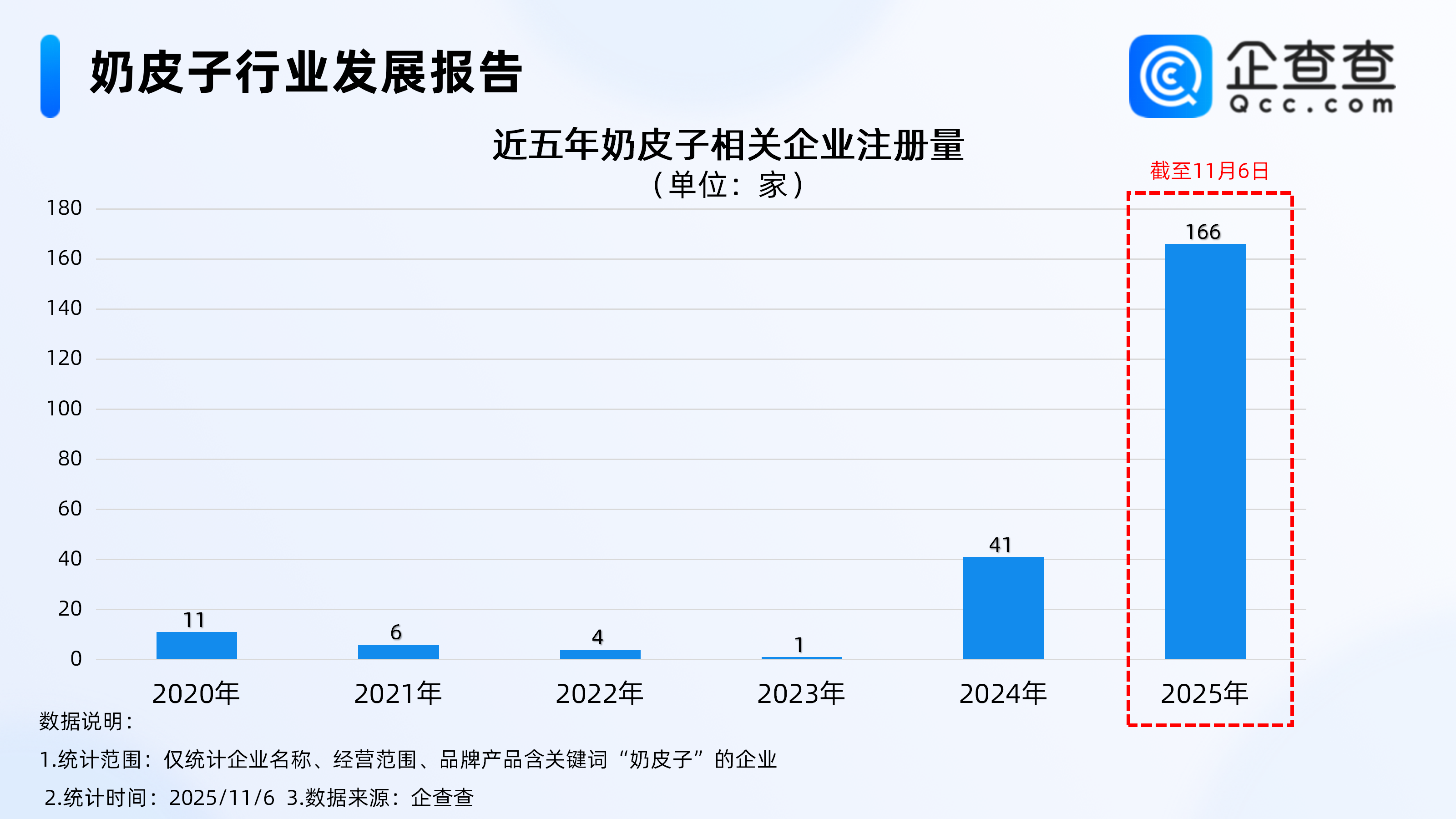 企查查數(shù)據(jù)顯示,注冊量方面,2024年起,奶皮子相關(guān)企業(yè)注冊量較往年相比增長明顯,特別是2025年,漲勢明顯。截至目前,今年已注冊166家奶皮子相關(guān)企業(yè),是去年全年注冊量的4倍。