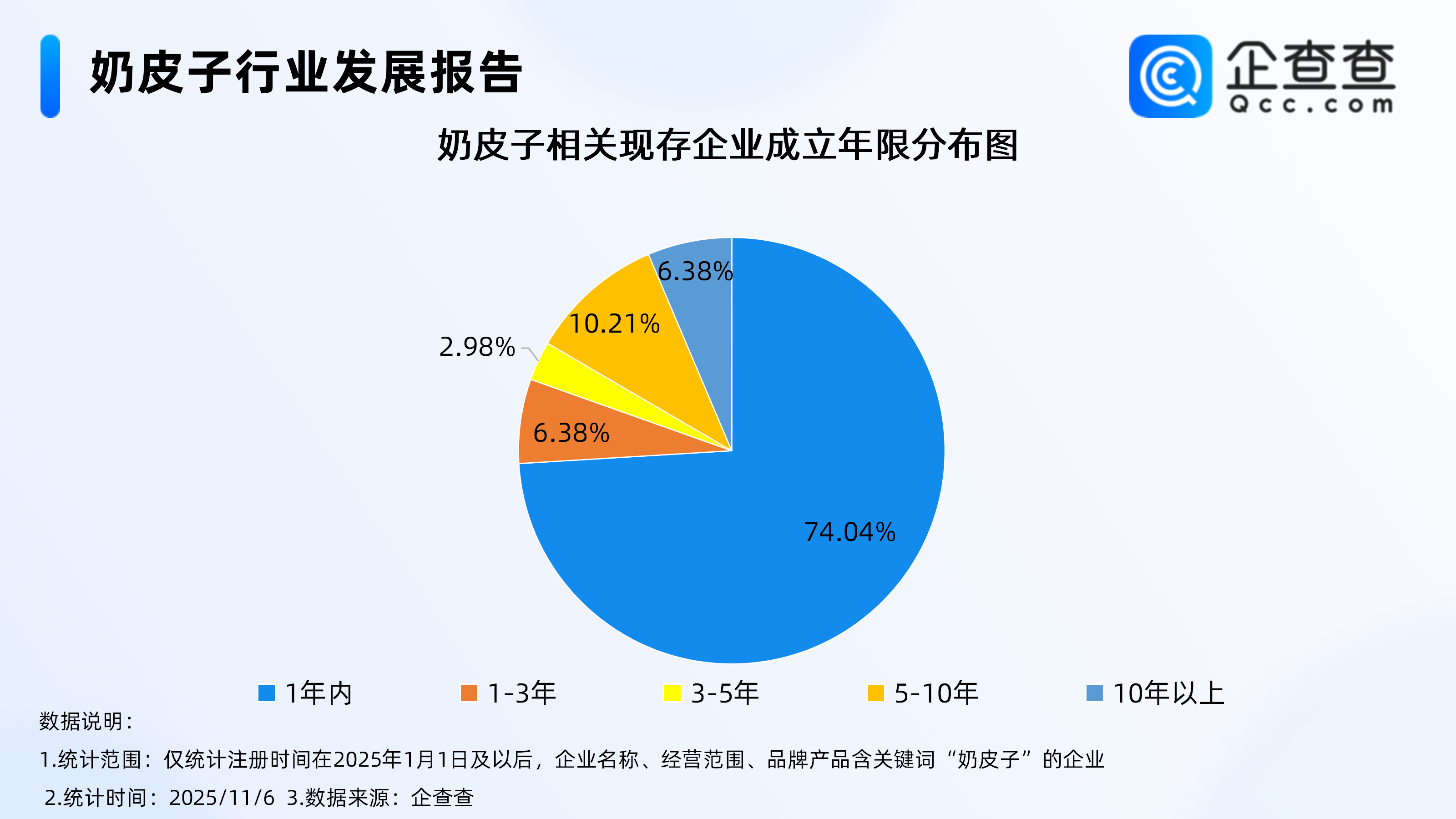 企查查數(shù)據(jù)顯示,截至11月6日,國內(nèi)奶皮子相關(guān)企業(yè)現(xiàn)存量達(dá)235家,超7成相關(guān)企業(yè)成立于1年內(nèi),占比達(dá)74.04%。其次為成立年限在5-10年的相關(guān)企業(yè),占比達(dá)10.21%。