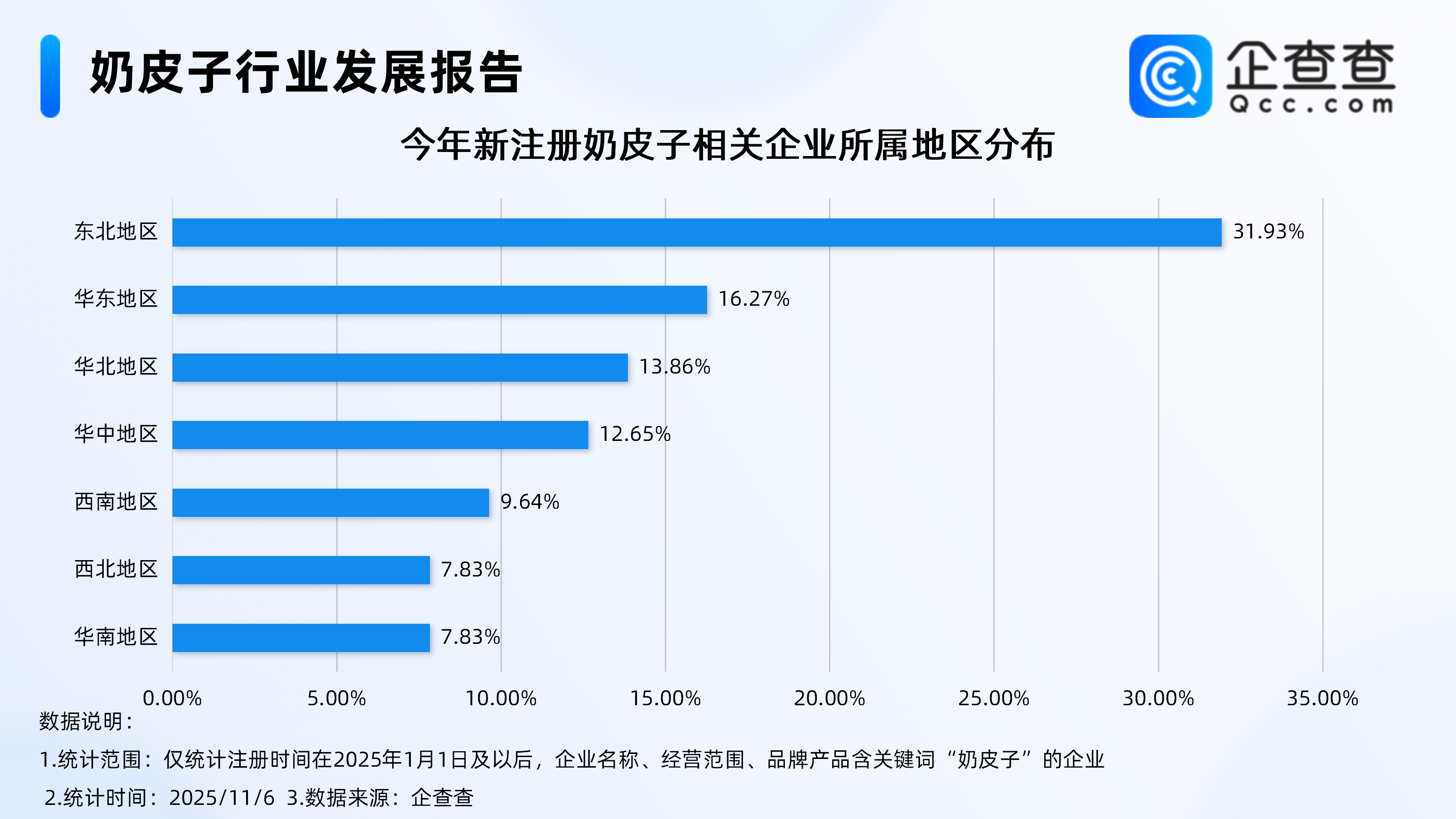 企查查數(shù)據(jù)顯示,從地域分布來看,今年新注冊的奶皮子相關(guān)企業(yè),多分布在東北地區(qū),占比達(dá)31.93%,其次為華東、華北地區(qū),分別占比16.27%、13.86%。