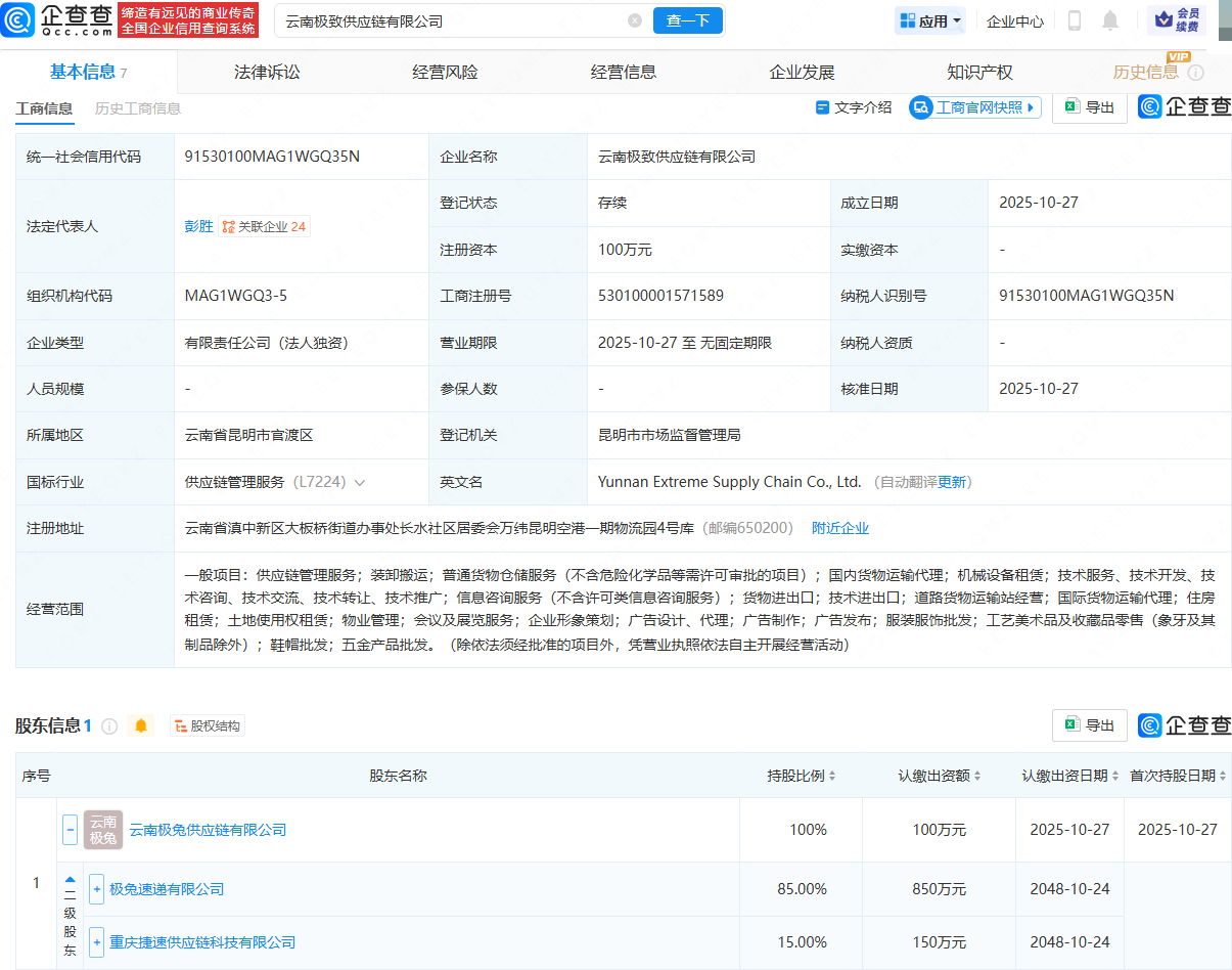 企查查APP顯示,近日,云南極致供應(yīng)鏈有限公司成立,法定代表人為彭勝,經(jīng)營范圍包含:供應(yīng)鏈管理服務(wù);裝卸搬運(yùn);貨物進(jìn)出口;技術(shù)進(jìn)出口;道路貨物運(yùn)輸站經(jīng)營;國際貨物運(yùn)輸代理等。企查查股權(quán)穿透顯示,該公司由極兔速遞有限公司旗下云南極兔供應(yīng)鏈有限公司全資持股。