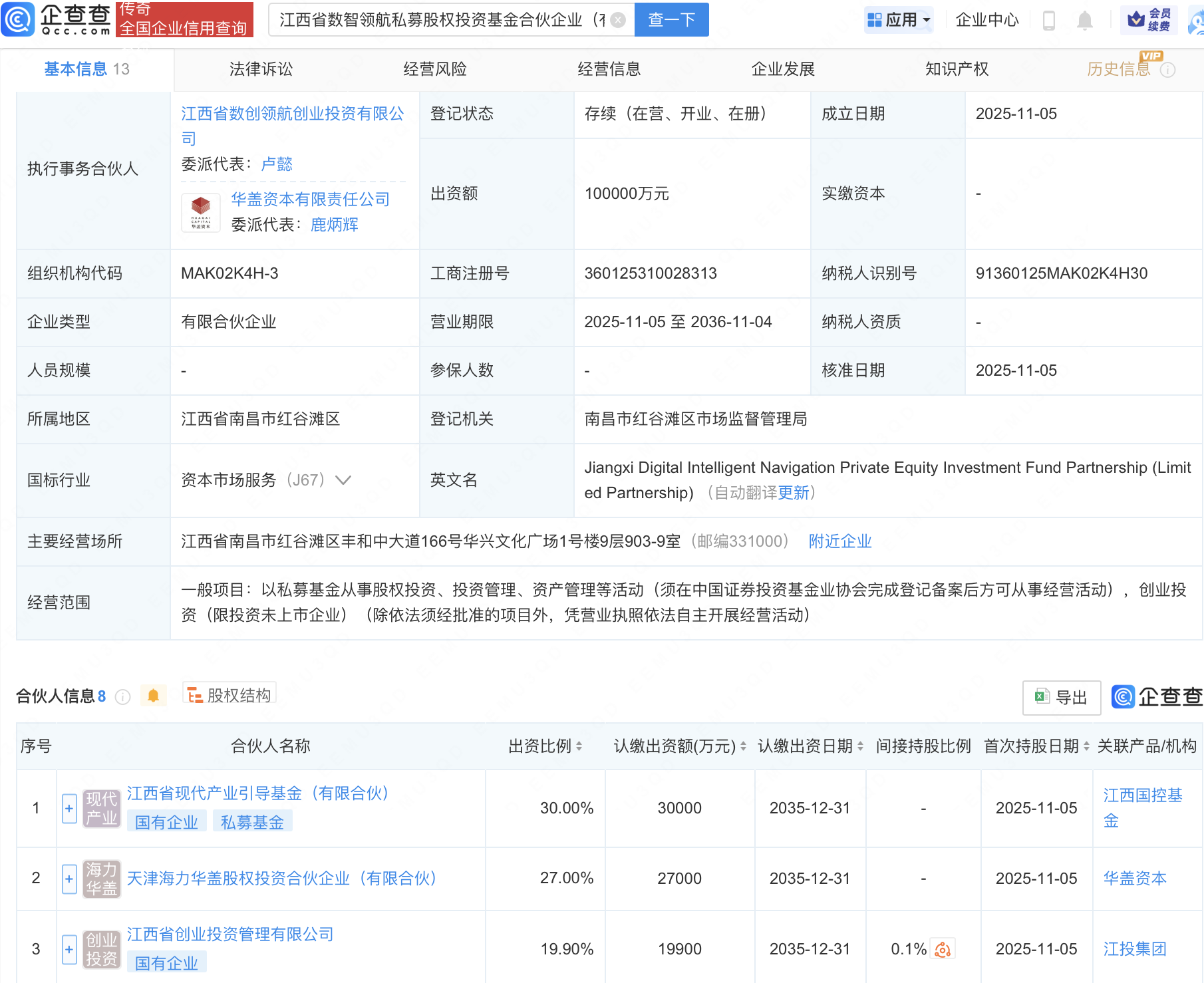 企查查APP顯示,近日,江西省數(shù)智領(lǐng)航私募股權(quán)投資基金合伙企業(yè)(有限合伙)成立,出資額10億元,經(jīng)營(yíng)范圍包含:以私募基金從事股權(quán)投資、投資管理、資產(chǎn)管理等活動(dòng)。企查查股權(quán)穿透顯示,該企業(yè)由江西省現(xiàn)代產(chǎn)業(yè)引導(dǎo)基金(有限合伙)等共同出資。
