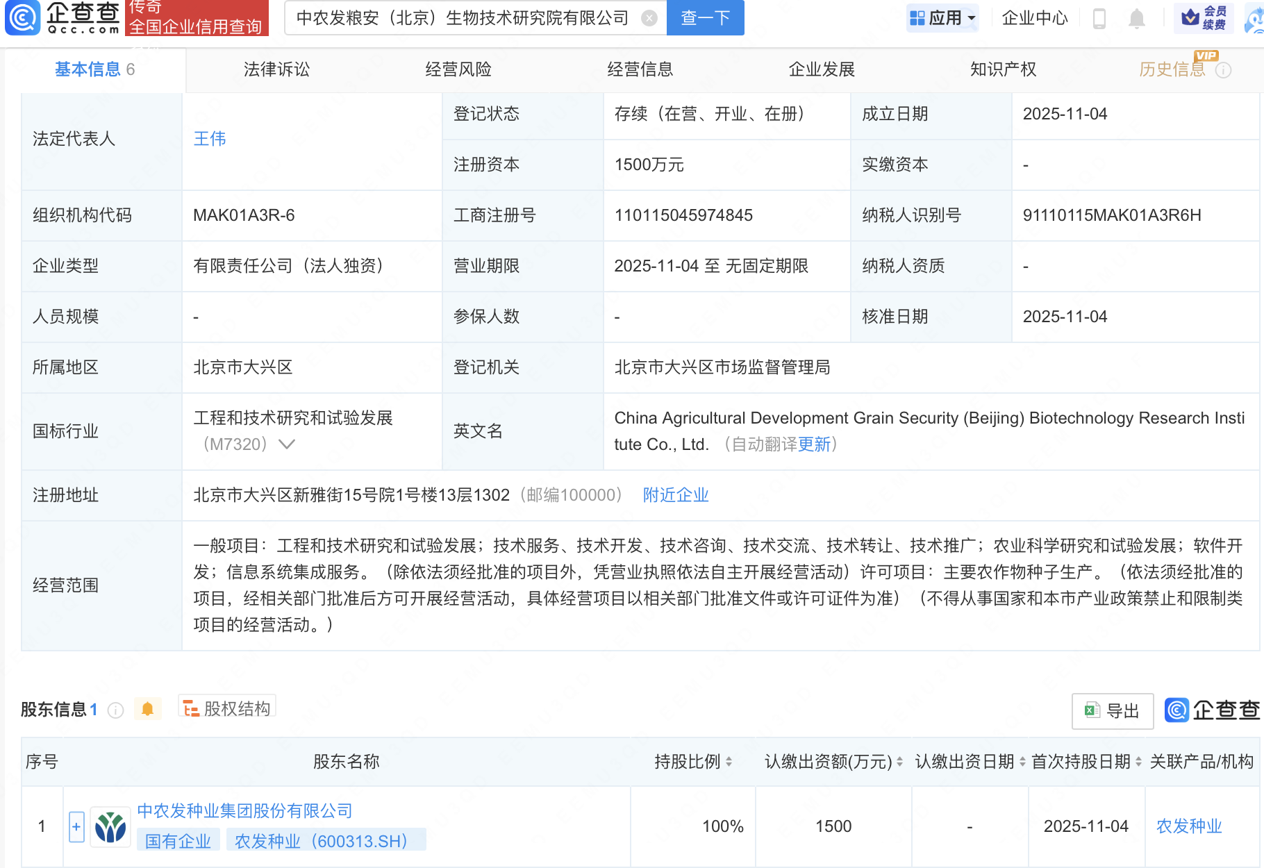 企查查APP顯示,近日,中農(nóng)發(fā)糧安(北京)生物技術(shù)研究院有限公司成立,注冊資本1500萬元,經(jīng)營范圍包含:農(nóng)業(yè)科學(xué)研究和試驗(yàn)發(fā)展;軟件開發(fā);信息系統(tǒng)集成服務(wù);主要農(nóng)作物種子生產(chǎn)等。企查查股權(quán)穿透顯示,該公司由農(nóng)發(fā)種業(yè)(600313)全資持股。