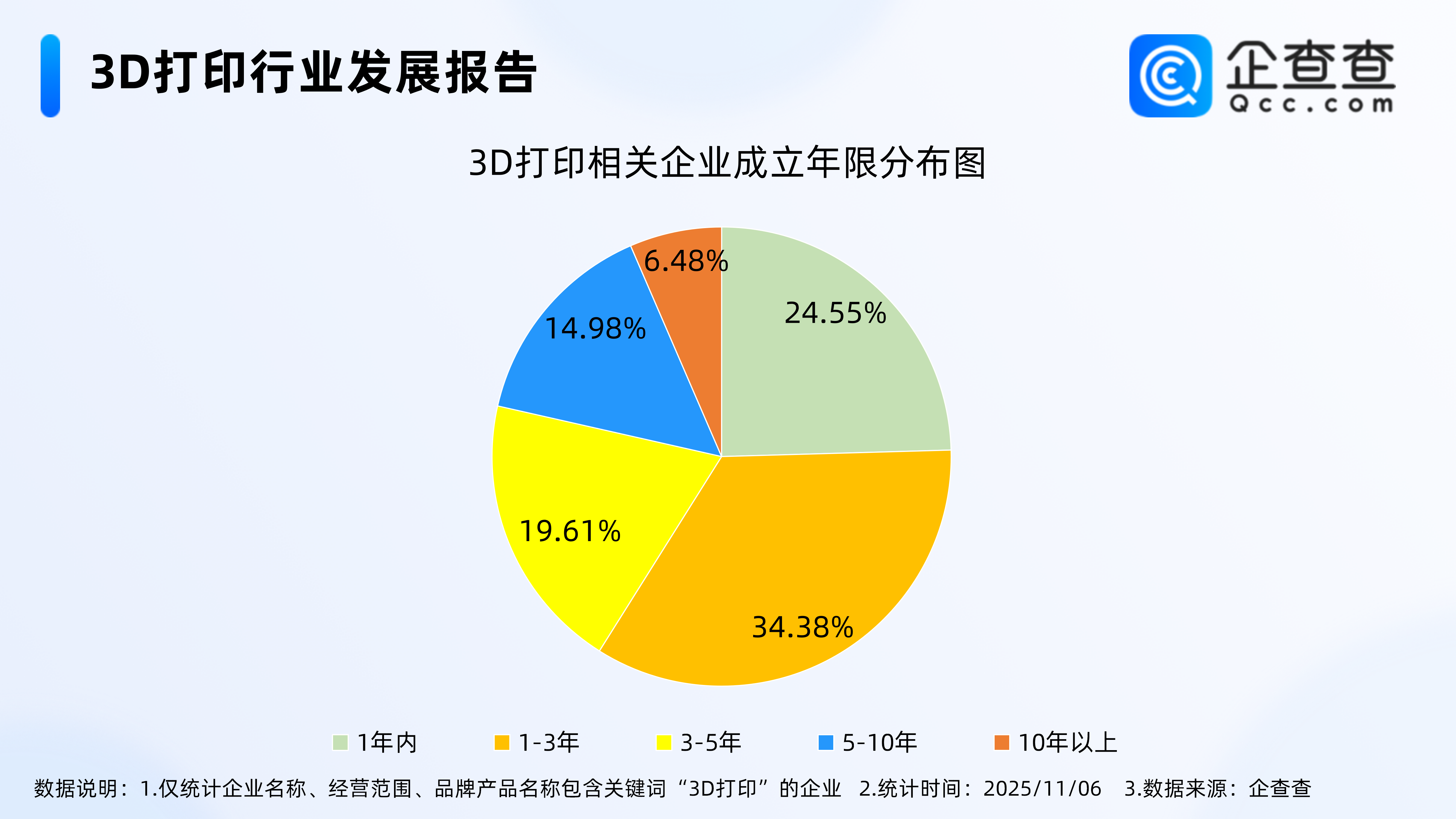 企查查數(shù)據(jù)顯示,從經(jīng)營(yíng)時(shí)間來(lái)看,3D打印相關(guān)現(xiàn)存企業(yè)多成立于近三年,成立年限在1-3年的相關(guān)企業(yè)最多,占比34.38%。其次,成立年限在1年內(nèi)的相關(guān)企業(yè)占比24.55%。