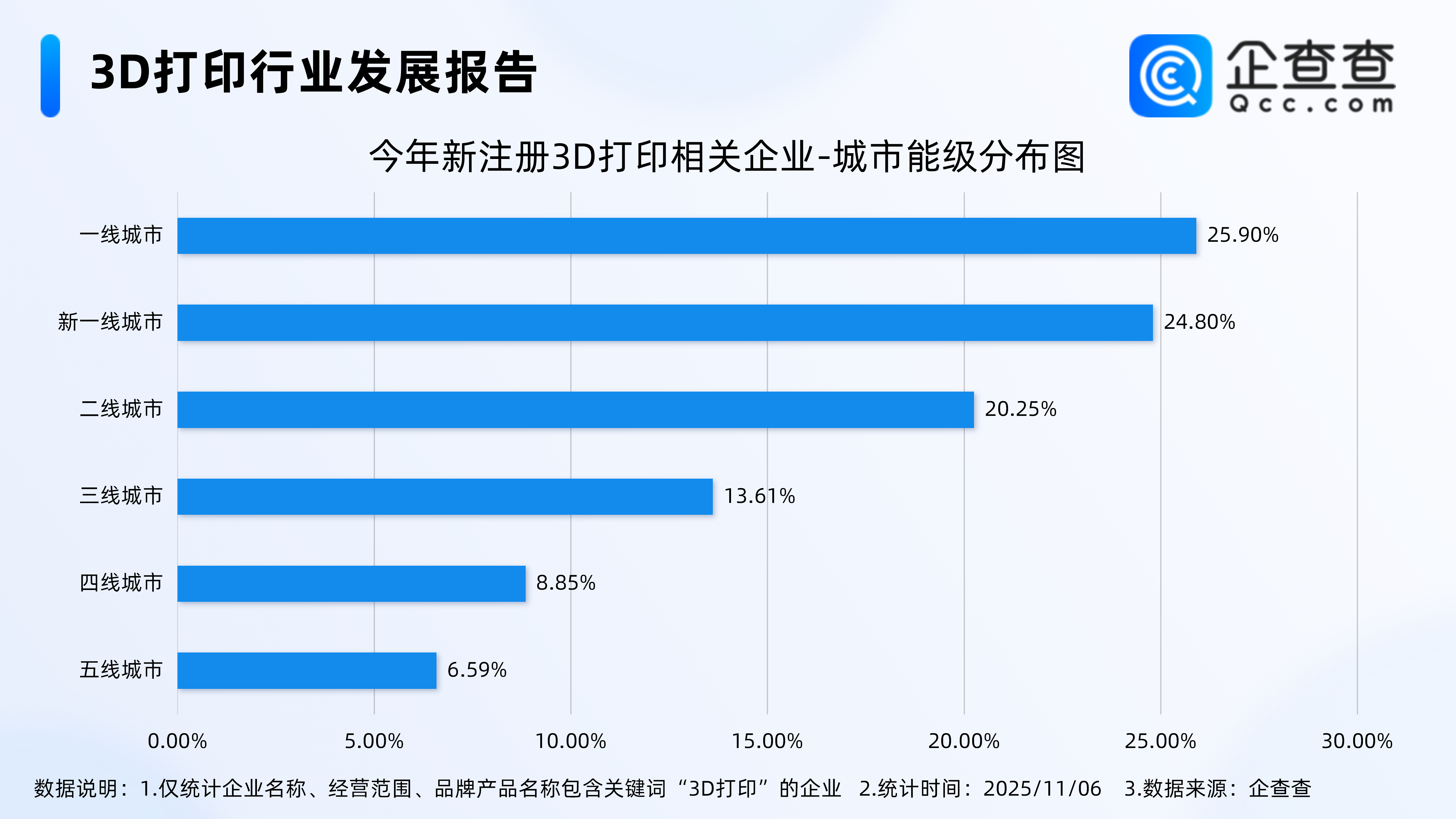 企查查數(shù)據(jù)顯示,從城市能級(jí)分布來(lái)看,今年新注冊(cè)3D打印相關(guān)企業(yè)的分布與城市能級(jí)高低呈正相關(guān),一線城市相關(guān)企業(yè)的貢獻(xiàn)率最高,達(dá)25.90%。其次,分布在新一線城市、二線城市的相關(guān)企業(yè)分別占比24.80%、20.25%。