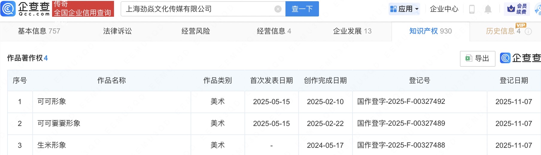 企查查APP顯示,近日,上海勁焱文化傳媒有限公司登記“可可嫑嫑形象”“可可形象”“生米形象”作品著作權(quán),作品類別均為美術(shù)。該公司經(jīng)營范圍包括演出經(jīng)紀(jì)、營業(yè)性演出等,由周深、張銘共同持股。