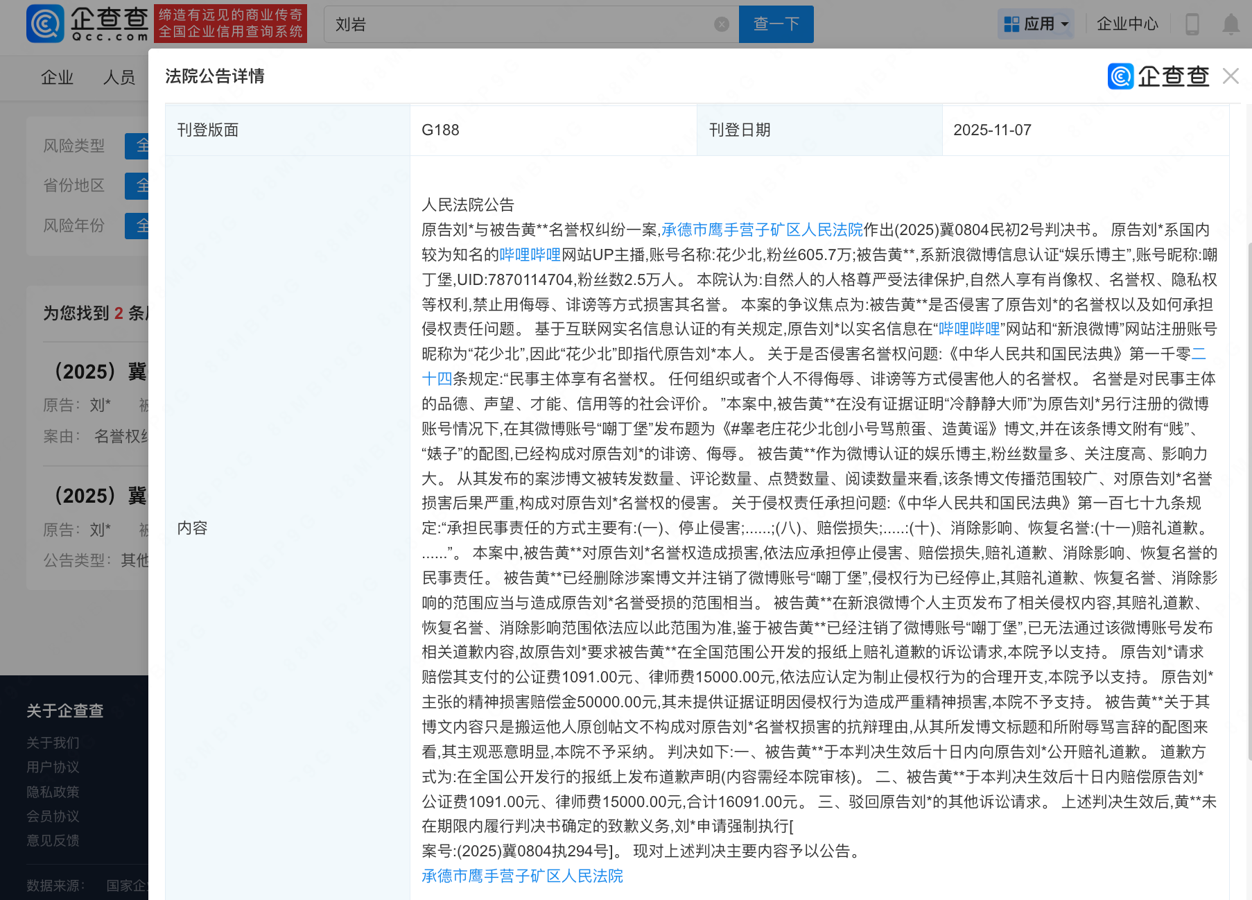 企查查APP顯示,近日,法院刊登B站游戲區(qū)UP主花少北(劉巖)與兩人名譽(yù)權(quán)糾紛案件,因兩被告未履行致歉義務(wù),花少北申請(qǐng)強(qiáng)制執(zhí)行。判決內(nèi)容顯示,被告在無(wú)證據(jù)證明情況下,詆毀花少北開(kāi)小號(hào)造黃謠、開(kāi)盒女生,并使用侮辱詞匯,構(gòu)成誹謗、侮辱等,法院判決兩被告向原告公開(kāi)賠禮道歉,并分別賠償維權(quán)費(fèi)用1.6萬(wàn)元,其中花少北主張精神損害賠償金5萬(wàn)元,其未提供證據(jù)證明因侵權(quán)行為造成嚴(yán)重精神損害,法院不予支持。