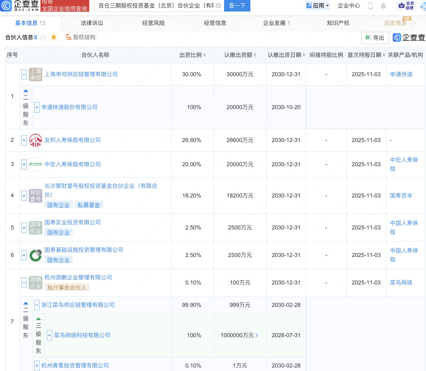 企查查APP顯示,近日,吉倉(cāng)三期股權(quán)投資基金(北京)合伙企業(yè)(有限合伙)成立,出資額10億元,經(jīng)營(yíng)范圍包含:私募股權(quán)投資基金管理、創(chuàng)業(yè)投資基金管理服務(wù)。企查查股權(quán)穿透顯示,該企業(yè)由申通快遞(002468)全資子公司上海申徹供應(yīng)鏈管理有限公司、菜鳥(niǎo)網(wǎng)絡(luò)科技有限公司旗下杭州游鵬企業(yè)管理有限公司、友邦人壽保險(xiǎn)有限公司等共同出資。